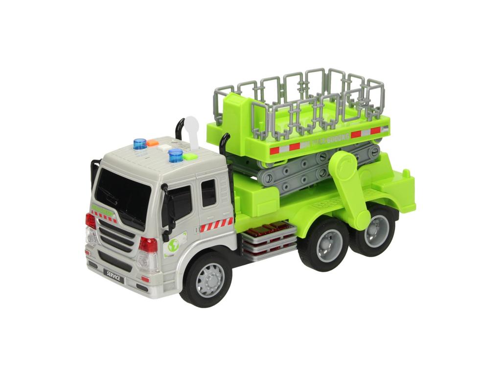 Teherautó emelőplatformmal, hogy mindent elérjen. Kapcsolja be a fényeket és a hangot, és induljon! A teherautó mérete 26 x 10 x 13,5 centiméter, és 3 éves kortól alkalmas.