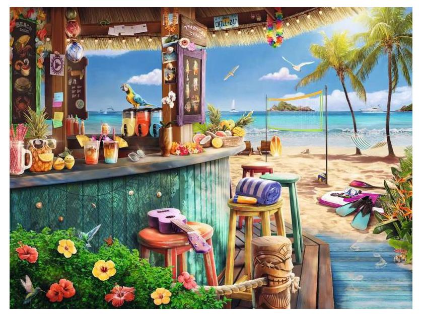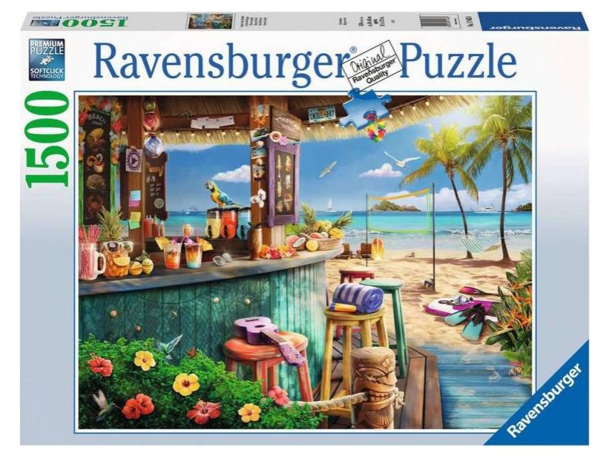 A Ravensburger 1500 db-os puzzle - Beach Bar című képen egy hangulatos tengerparti bár jelenik meg.