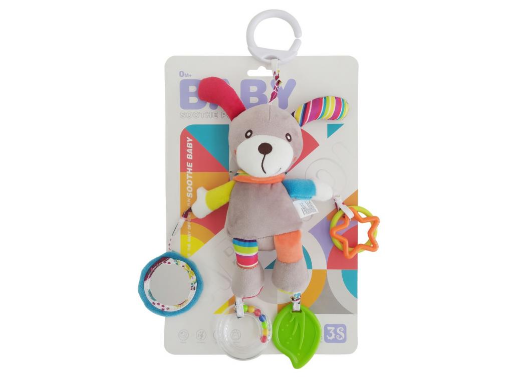 A Plüss kutya csörgővel egy aranyos és puha játék, amely kifejezetten a legkisebbek számára készült.