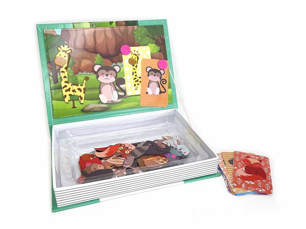A készlet állatképekkel ellátott kártyákat tartalmaz, a gyerkőc feladata, hogy a sablon szerint elrendezze a mágneses elemeket úgy, hogy az teljesen visszaadja az adott képet. A rejtvények hosszú ideig szolgálják a gyermeket a különféle kreatív képek készítésének lehetőségének köszönhetően. Felébreszti a gyermek művészi érzékenységét és edzi a logikus gondolkodást.