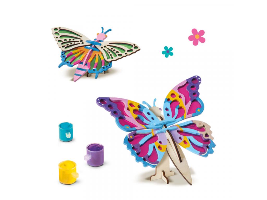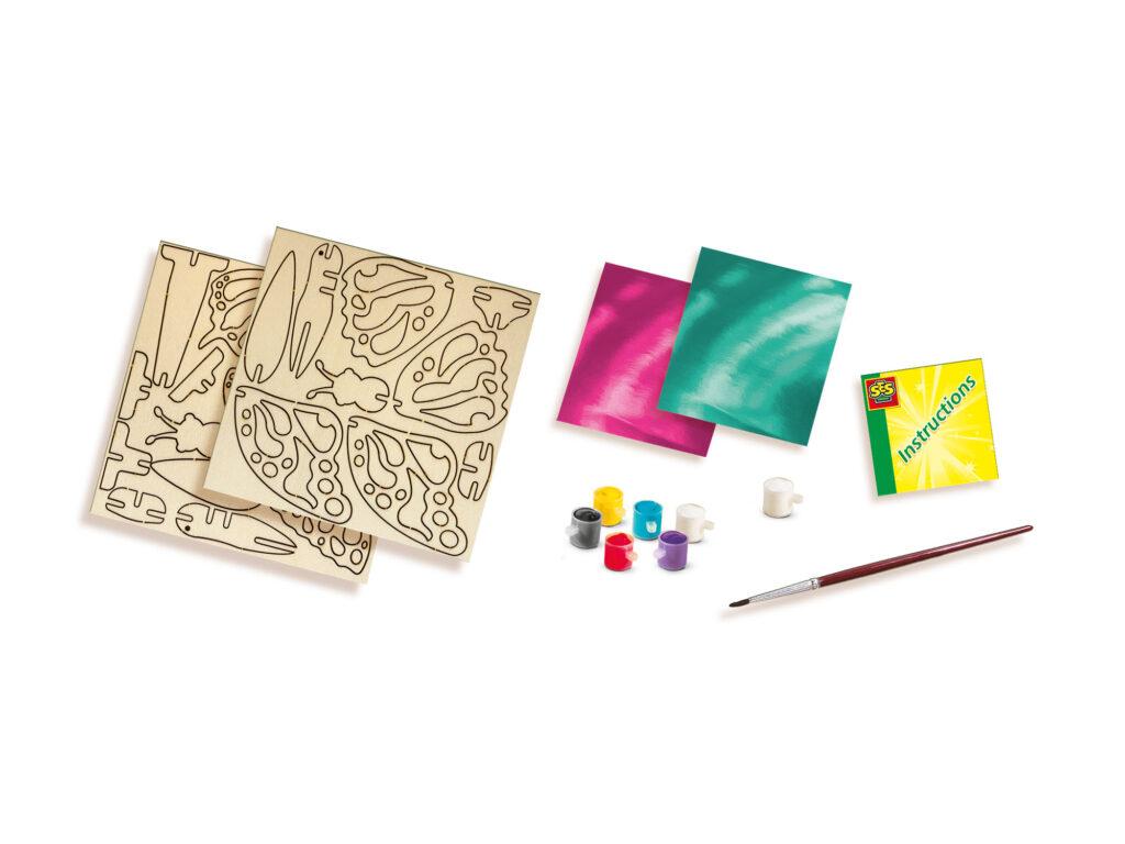 Tartalmaz: 2 db fából készült pillangó testrészt, 6 db festéket, 1 db ecsetet, 1 db ragasztót, rózsaszín és türkiz pauszpapírt, 1 db használati utasítást tartalmaz.