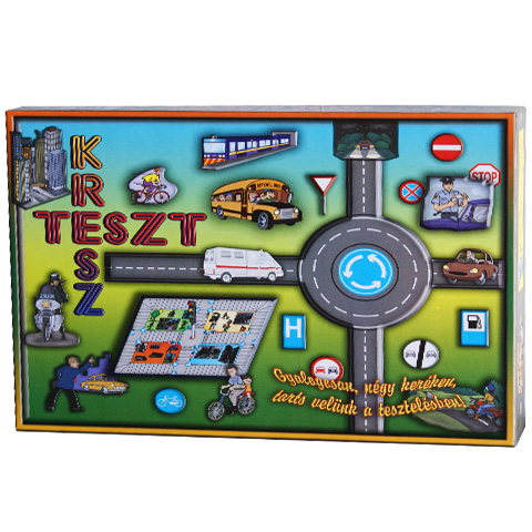 A Kresz-teszt-ben résztvevők játék közben szerezhetnek néhány információt, bővíthetik ismereteiket a közlekedés egyes szabályairól, ill. felfrissíthetik az általános Kresz-ben megtanultakat. Mindenki személy szerint t-1 bábut kap, amit a saját maga által kiválasztott ZEBRA mögé helyezi a játékmező közepén található nagy négyzetalakű mezőre. Ezúttal a ZEBRA képviseli mind a "start"- mind a "Cél"-mezőt. A játék kezdete előtt mindenki kiválasztja a korosztályának megfelelő kártyacsomagot, s azt összekeverve persze fajtánként külön-külön- jól elérhető, s látható helyre leteszi. A kedves résztvevők ülési sorrendben, az óramutató járásával megegyező irányban guríthatnak a dobókockával. A játékot 2-4 személy játszhatjaA Kresz-Teszt társasjáték 5 éves kortól ajánlott fiúknak és lányoknak is