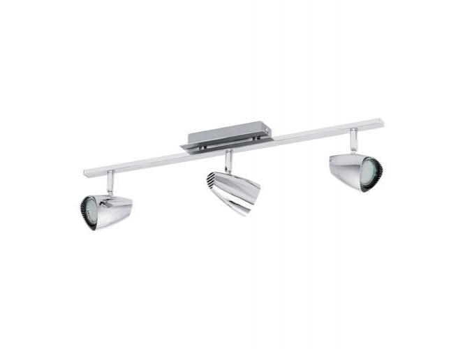 Ez a háromfejű spotlámpa a CORBERA sorozatból krómozott acélból és műanyagból készült, és három GU10-LED-lámpával van felszerelve a meleg fehér fényért.