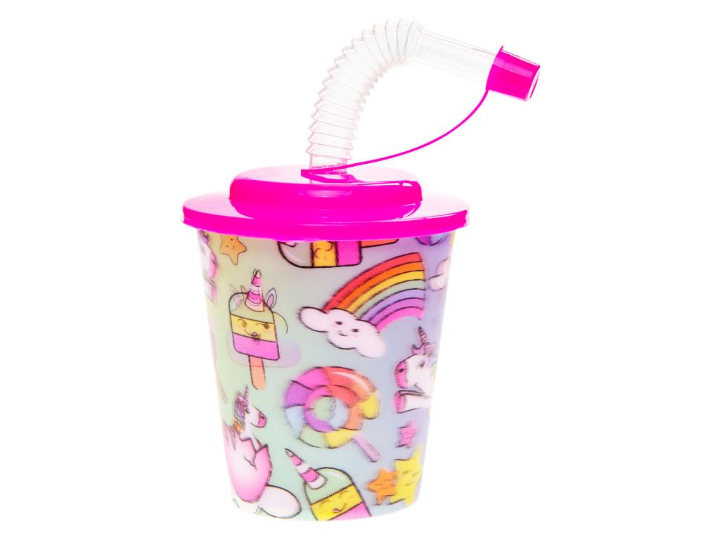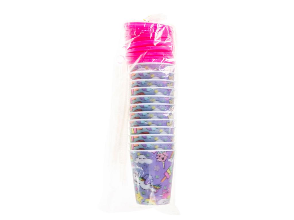 Unikornis stílusú, rózsaszín fedeles, 12 darabos szívószálas pohár.