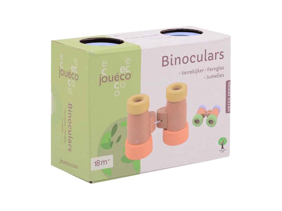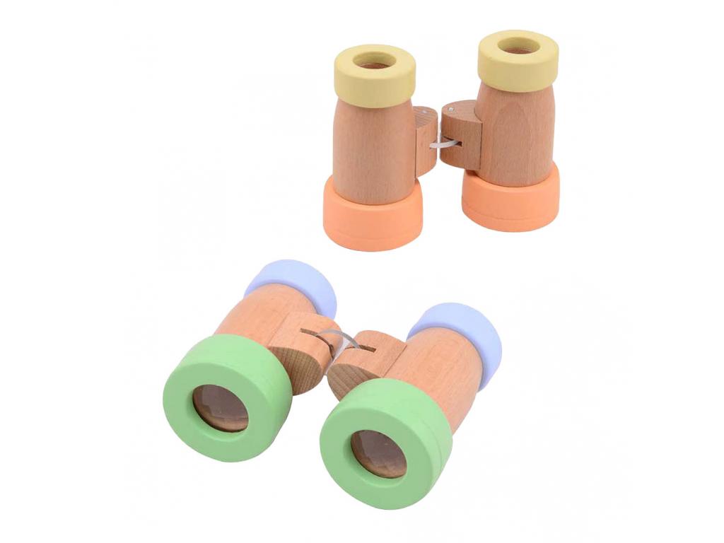 Fából készült távcső fazettált szemekkel. 18 hónapos és idősebb gyermekek számára alkalmas. A távcső kb. 13 cm hosszú, pasztellszínű fából készült.