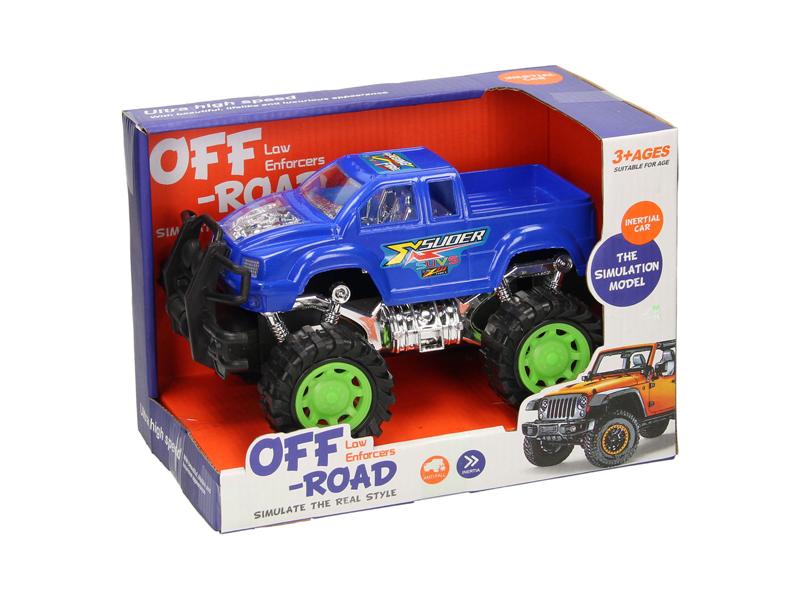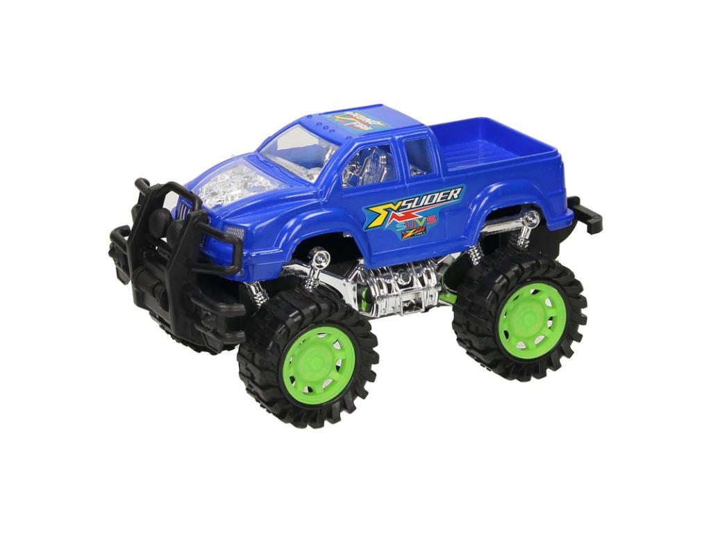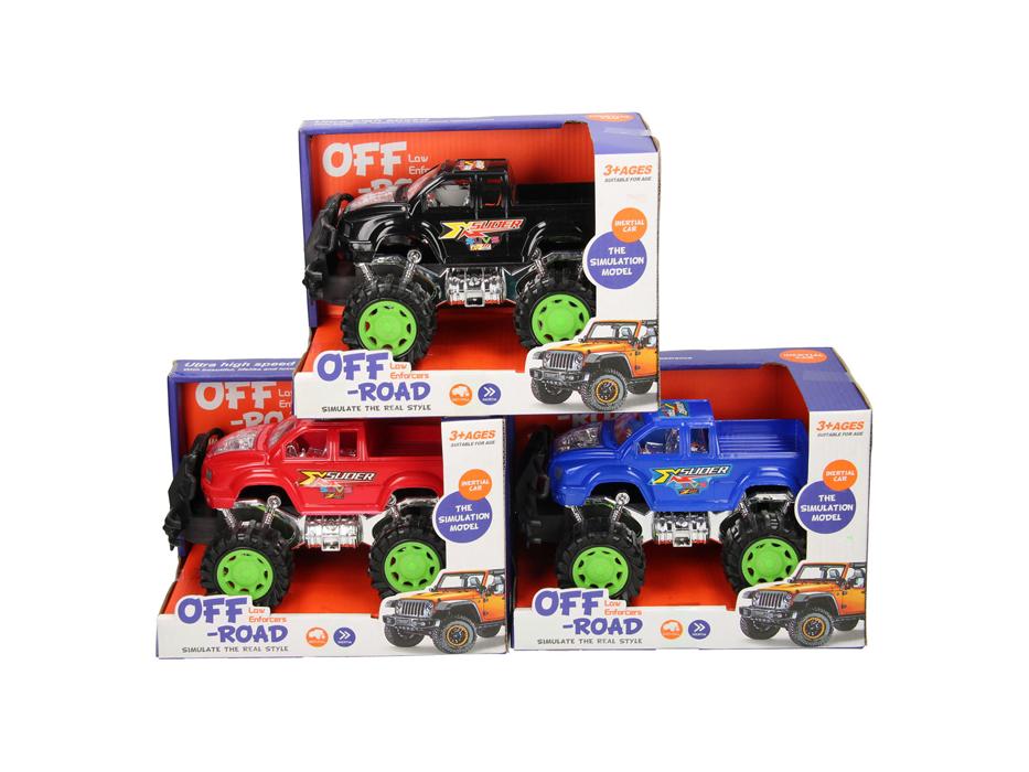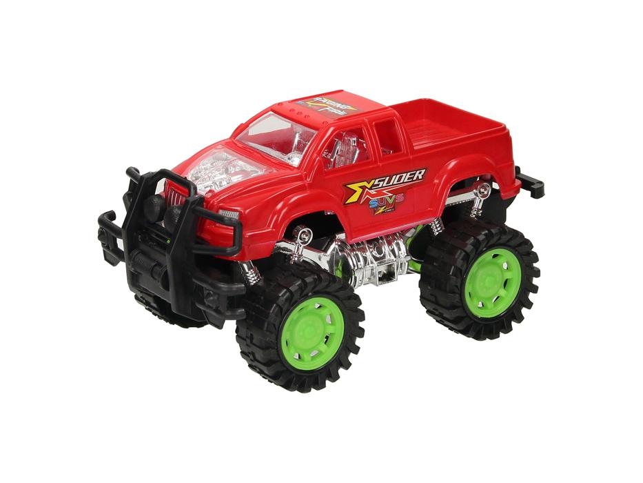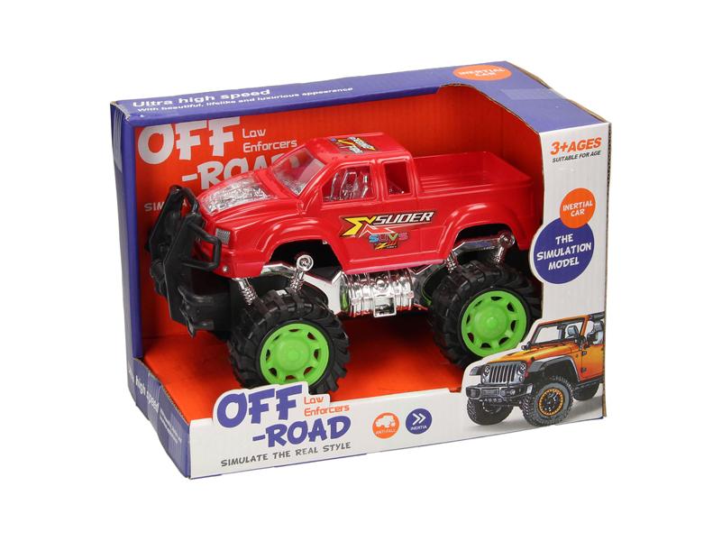 Terepjáró rakodóplatformmal. A teherautó piros, kék vagy fekete színben kapható, és zöld felnikkel rendelkezik. A teherautó 3 éves kortól alkalmas.
