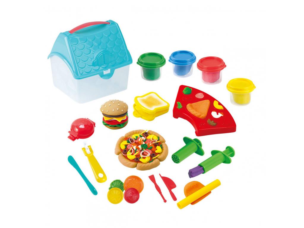 Készítsd el a saját hamburgeredet vagy pizzádat ezzel a játékkészlettel. A készlet 4 különböző színű gyurmából (4x 56 gramm), 7 formából és például a vágáshoz szükséges szerszámokból áll. Alkalmas 3 éves és idősebb gyermekek számára.