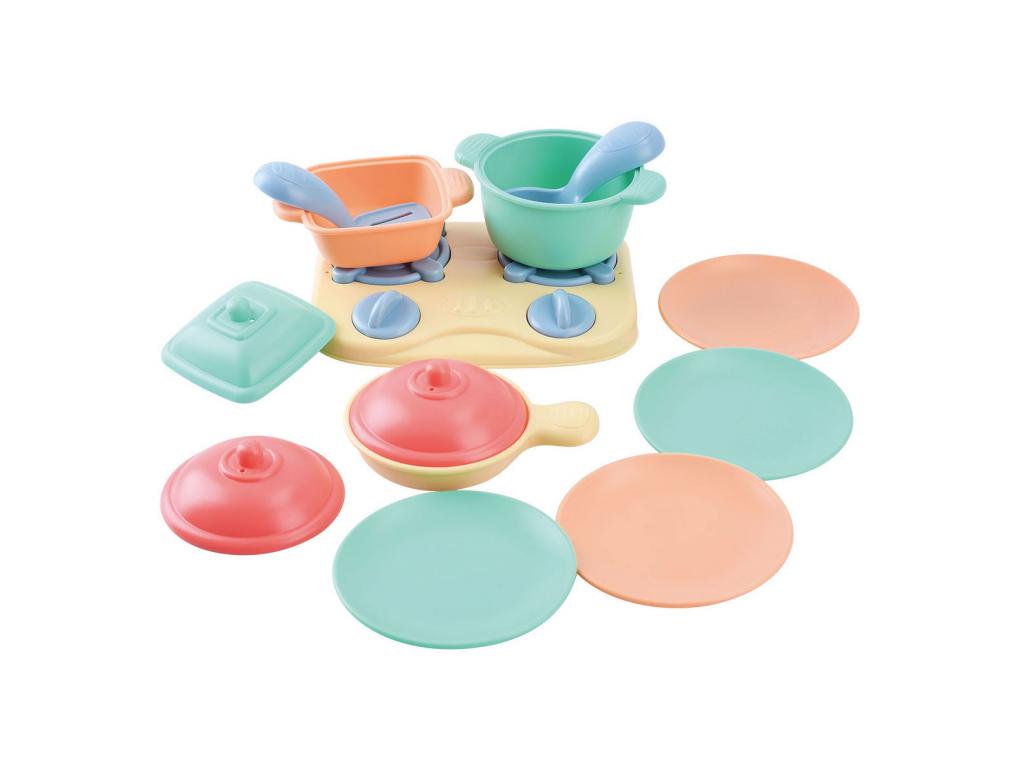 Részben újrahasznosított műanyagból készült főzőkészlet. A készlet egy főzőedényből, 3 fedeles serpenyőből, 4 tányérból és 2 spatulából áll. Legalább 24 hónapos gyermekek számára alkalmas.