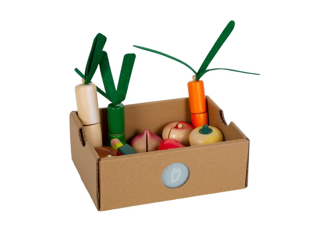 Játékkészlet gyümölcsök és zöldségek feldarabolásához. 24 hónapos és idősebb gyermekek számára alkalmas. A doboz mérete kb. 21 x 15 x 7,5 cm.