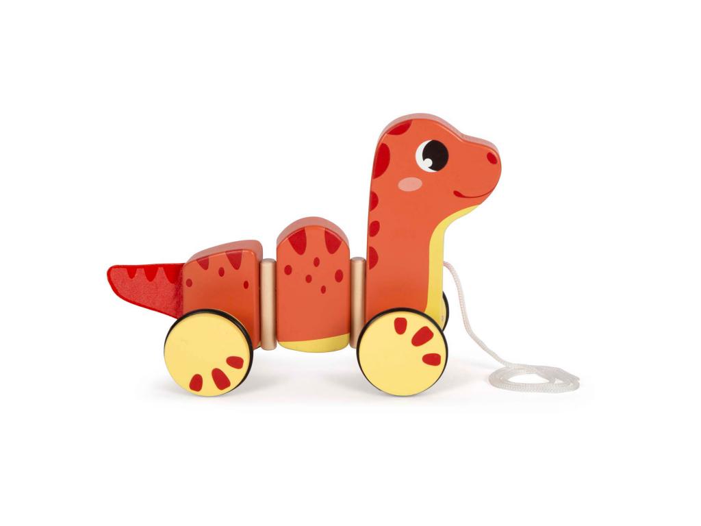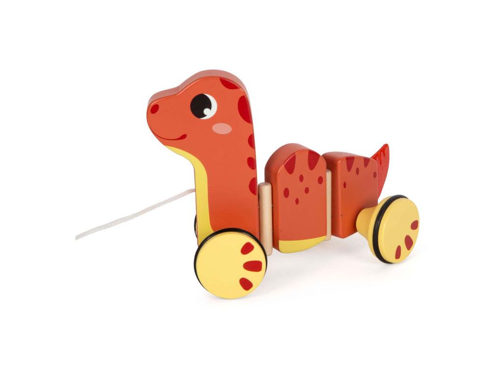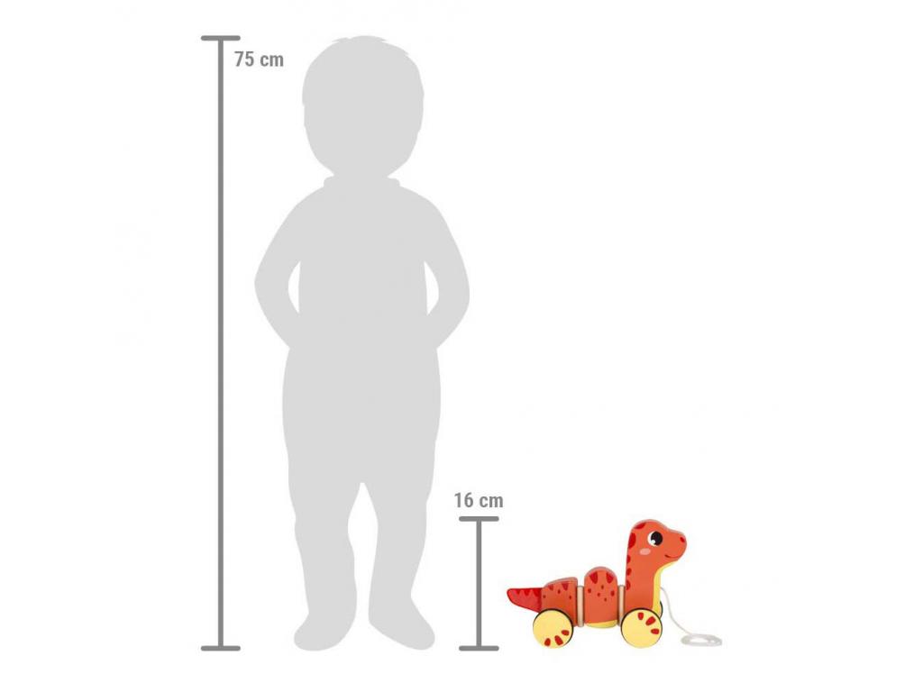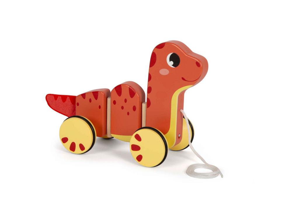 Húzható fából készült, kerekes dinoszaurusz. Alkalmas 12 hónapos és idősebb gyermekek számára. A dinoszaurusz mérete 23 x 10 x 16 cm.