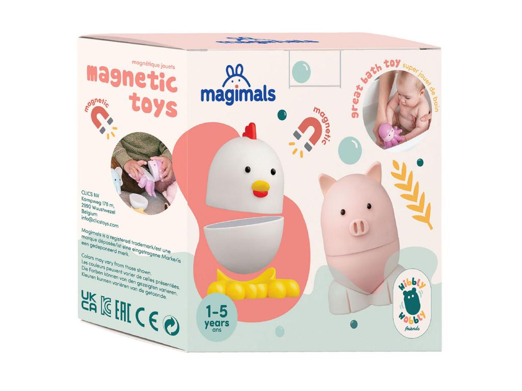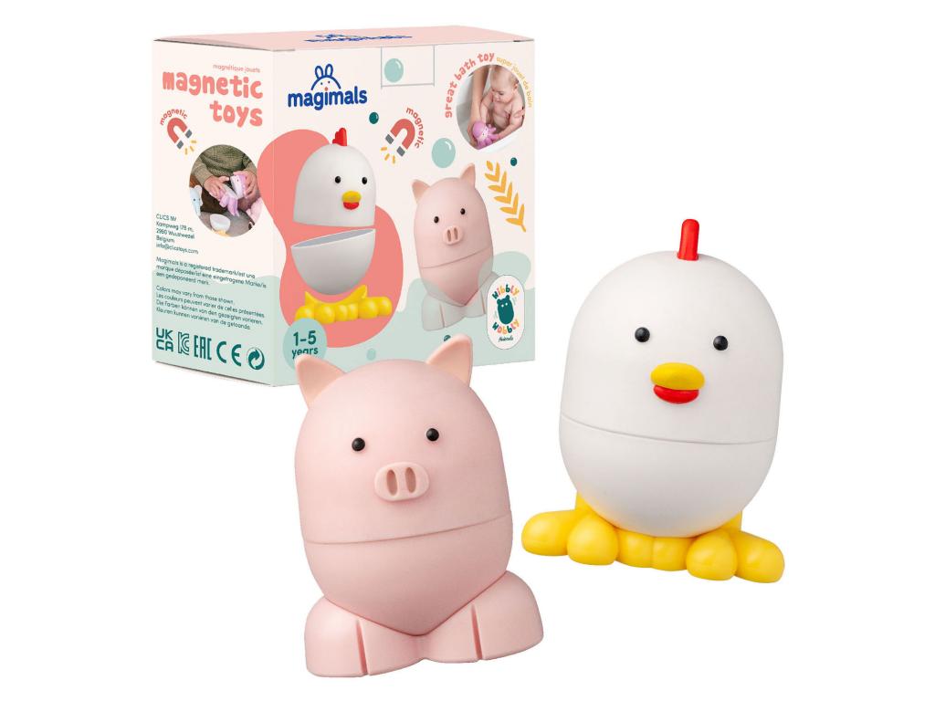 Mágneses tanyasi billegő állatok. Tartalom: 2 db 3 részből álló állat, amelyek a végtelenségig kombinálhatók. Puha anyagból készült, amely ellenáll a víznek, a csípésnek, a harapásnak és a szívásnak. Biztonságosan használható a kádban. Alkalmas 12 hónapos kortól.