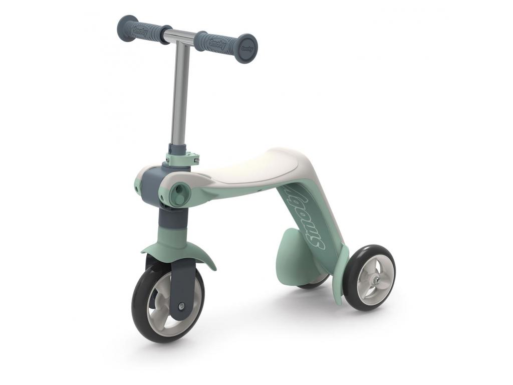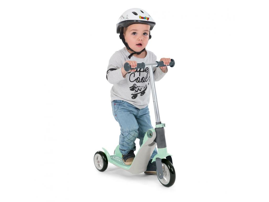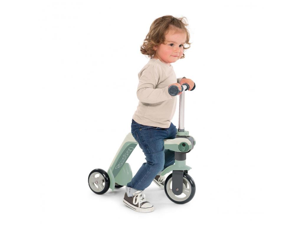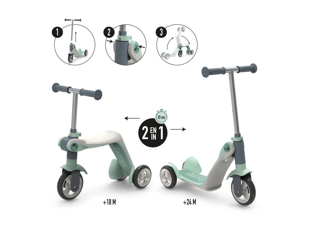 2 az 1-ben roller és tricikli a Smoby-tól, lágy zöld színekben, könnyű anyagokból készült, így súlya mindössze 2,9 kg. Ideális a kisgyermekek számára a mozgáshoz. Mérete 60 × 63 × 30 cm. Nincs szükség szerszámokra vagy kiegészítő anyagokra ahhoz, hogy robogóból egyensúlyozó kerékpárrá alakítsuk át. Csendes kerekeinek köszönhetően minden séta különösen pihentető. Különösen alkalmas 18-36 hónapos gyermekek számára.