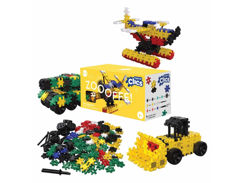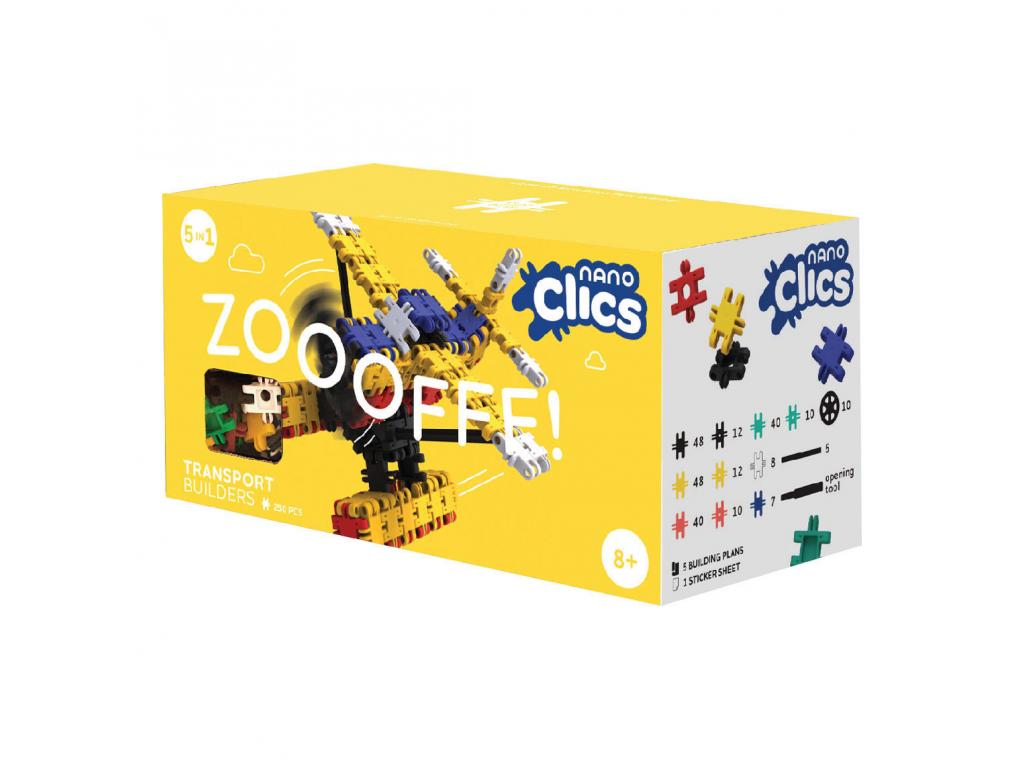 Nano Clics építőelemek közlekedési járművek gyártásához. A készlet 250 építőkockát és egy matricás lapot tartalmaz. Alkalmas 8 éves kortól.