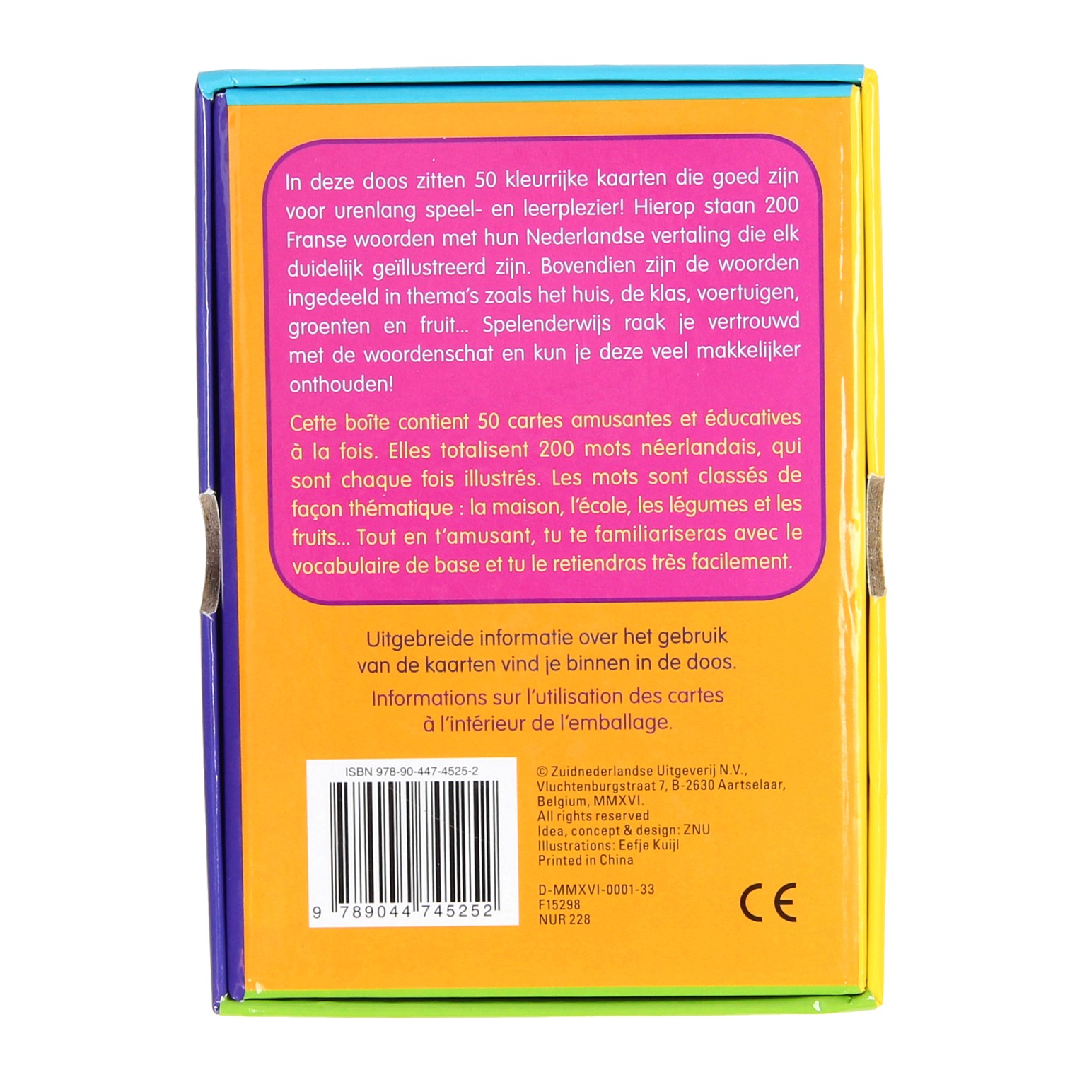 Ez a doboz 50 színes kártyát tartalmaz, amelyekkel órákon át szórakozhatsz és tanulhatsz! 200 francia szót tartalmaz holland fordításukkal, mindegyik világosan illusztrálva. Ezenkívül a szavak témák szerint vannak kategorizálva, például ház, osztályterem, járművek, zöldségek és gyümölcsök. A gyerekek játékos módon tanulják meg a szókincset, és sokkal könnyebben megjegyzik azt!