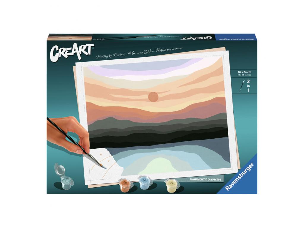 Fesse meg a CreArt Minimalista tájképet! Festés számok szerint a Ravensburgertől - bárki tud festeni! A számok alapján festés egyszerű festési technikájának köszönhetően gyerekjáték felébreszteni a benned rejlő művészt! A szabad festőfelületeknek köszönhetően egy 30,00 cm x 24 cm méretű, kicsi és gyönyörű műalkotást készíthetsz. A finom színárnyalatok elegáns színátmenetet és árnyjátékot biztosítanak. Csomagoljon ki és kezdjen el festeni egy minimalista tájképet!