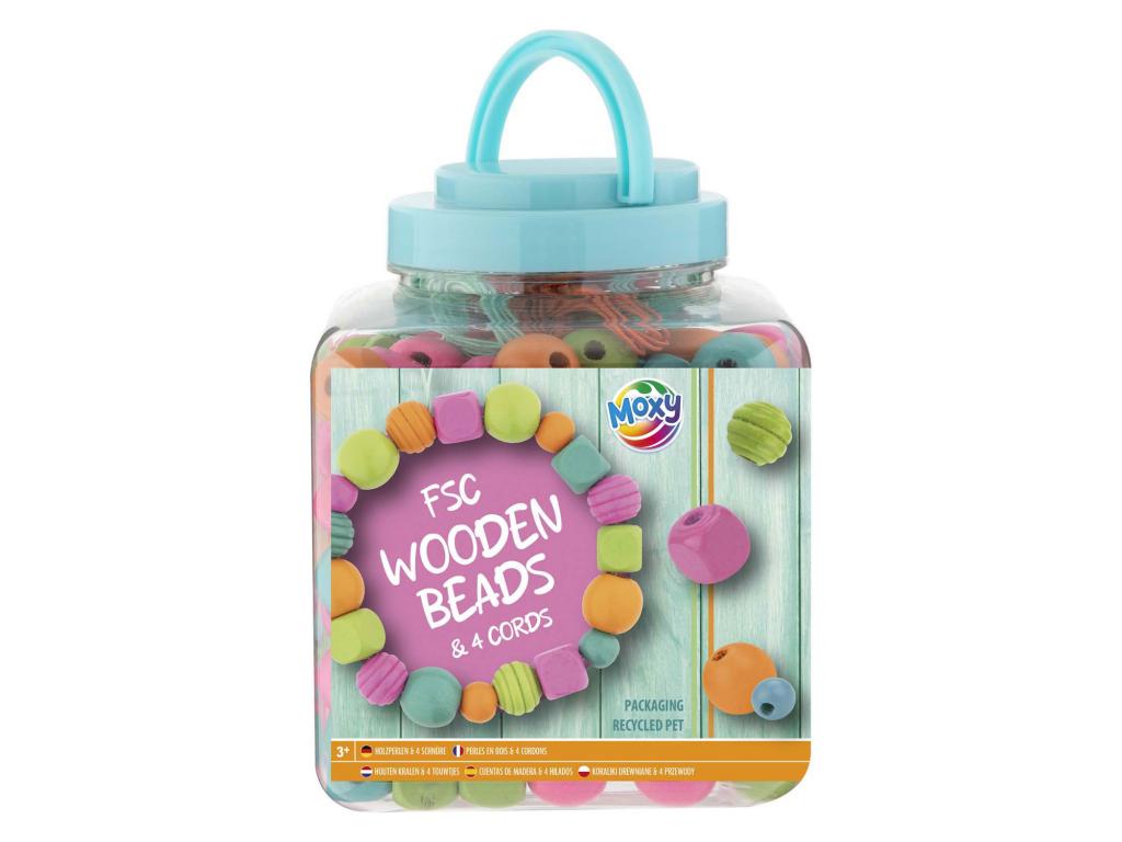 Vödör 375 gramm pasztellszínű fa gyöngyökkel és gumiszalaggal. Alkalmas 3 éves kortól.