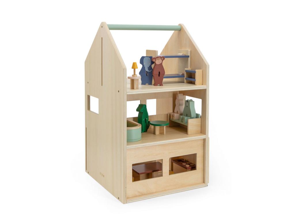 Játssz az összes állatbarátunkkal és a menő játszóházukkal! Csúsztasd a falakat a helyükre, és engedd szabadjára a fantáziádat. A 13 bútorkiegészítővel és 6 állatbaráttal a gyerekek órákig játszhatnak. A játszóház egyszerű kialakítású, és rengeteg teret hagy a gyerekek kreativitásának és képzeletének. Amikor a gyerekek befejezték a játékot, a földszinti falakat visszacsúsztathatják a helyükre, és az összes tartozékot tárolhatják benne, hogy semmi se vesszen kárba. A tetején található fogantyúval a gyerekek könnyedén magukkal vihetik a játszóházat, bárhová is viszi őket a fantáziájuk! A játszóház és a tartozékok 100%-ban FSCŠ minősítésű fából készültek. Minden szín vízbázisú és biztonságos a csecsemők számára.