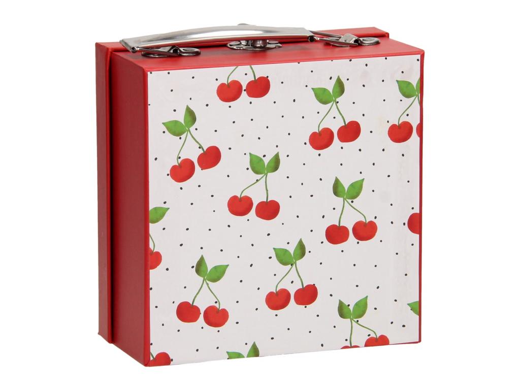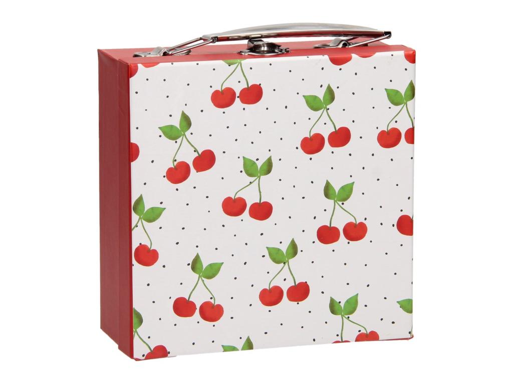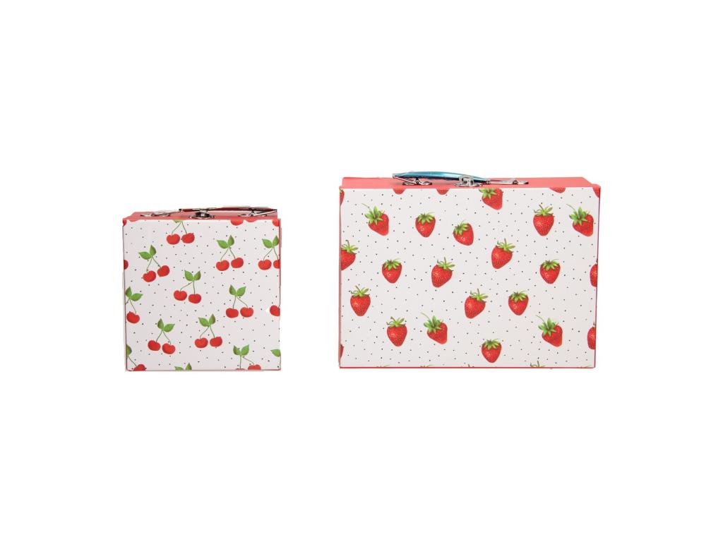 Kétrészes bőröndkészlet gyümölcsmotívummal. A nagyobbik bőröndön eper, a kisebbiken cseresznye látható. A kisebb bőrönd beleillik a nagy bőröndbe. A nagy bőrönd méretei: 25 x 29 x 9 centiméter. A kis bőrönd méretei: 15 x 15 x 7 centiméter.