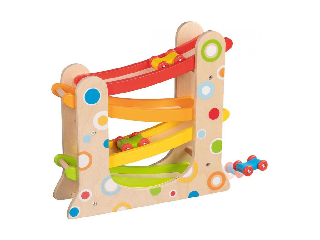 Az élénk Goki autóverseny-pálya. Ez a fából készült autóversenypálya szinte kézzelfogható dinamizmusával inspirál. Ez a vidám, színes, játékra hívó dizájn lenyűgözően támogatja a gyönyörűen formázott karosszériát. A játékok azonban csak akkor érvényesülnek igazán, amikor a 3 fa jármű végigszáguld a pályán. Helyezd az autókat a felső pályára, figyelj és hallgass, vedd fel a járművet az alsó kijáratnál, és helyezd vissza a tetejére. Ez nem csak mókának és akciónak hangzik, hanem aktív szórakozás a legmagasabb szinten. Méretek: 30 x 8,5 x 28 cm. Anyag: fa. Alkalmas 2 éves kortól.