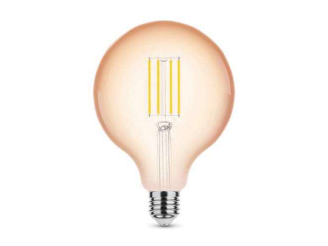 LED lámpa , égő , izzószálas hatás , filament , E27 foglalat , G125 , 4 Watt , dimmelhető , meleg fehér , 1800K , borostyán sár