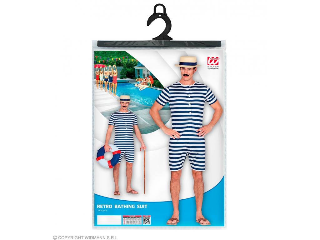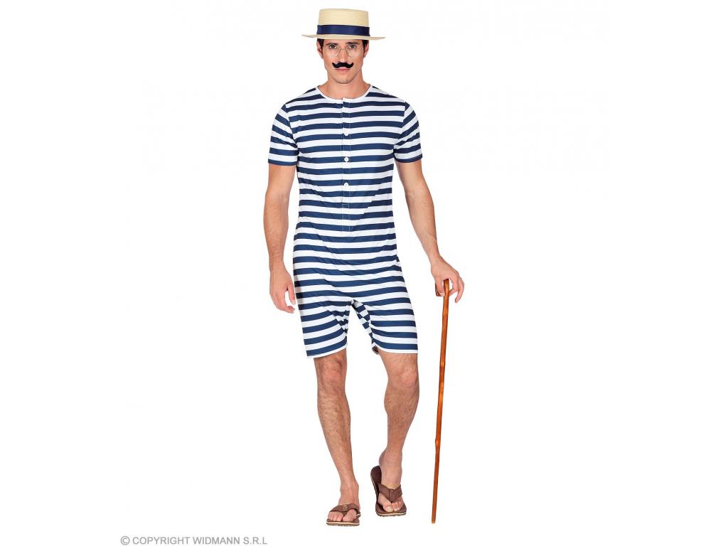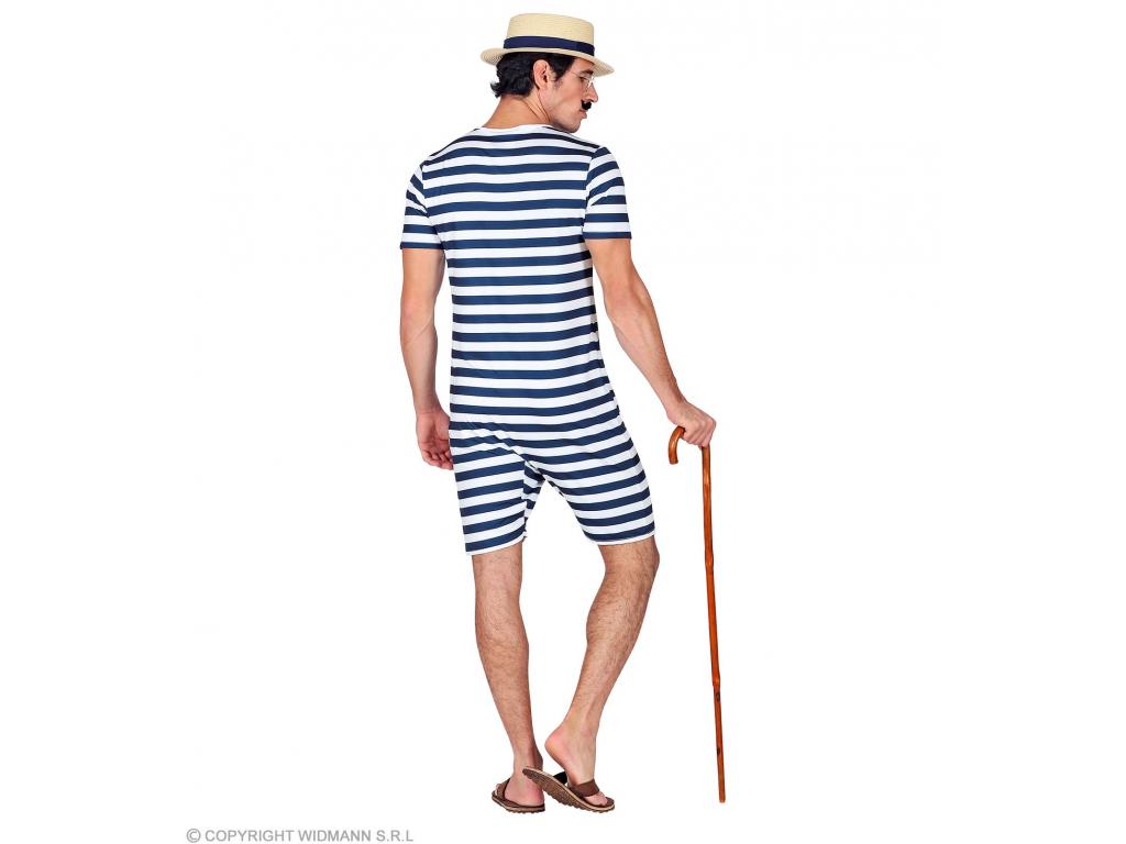 A Retro fürdőruha kék fehér csíkos férfi jelmez leírása: