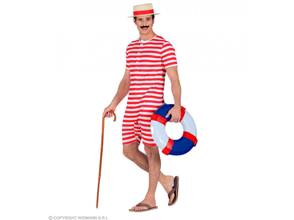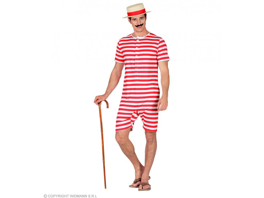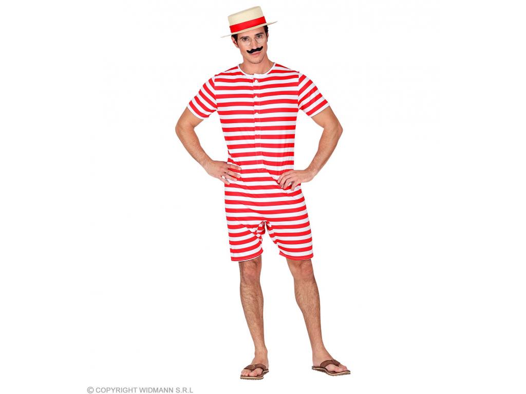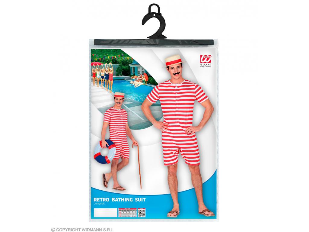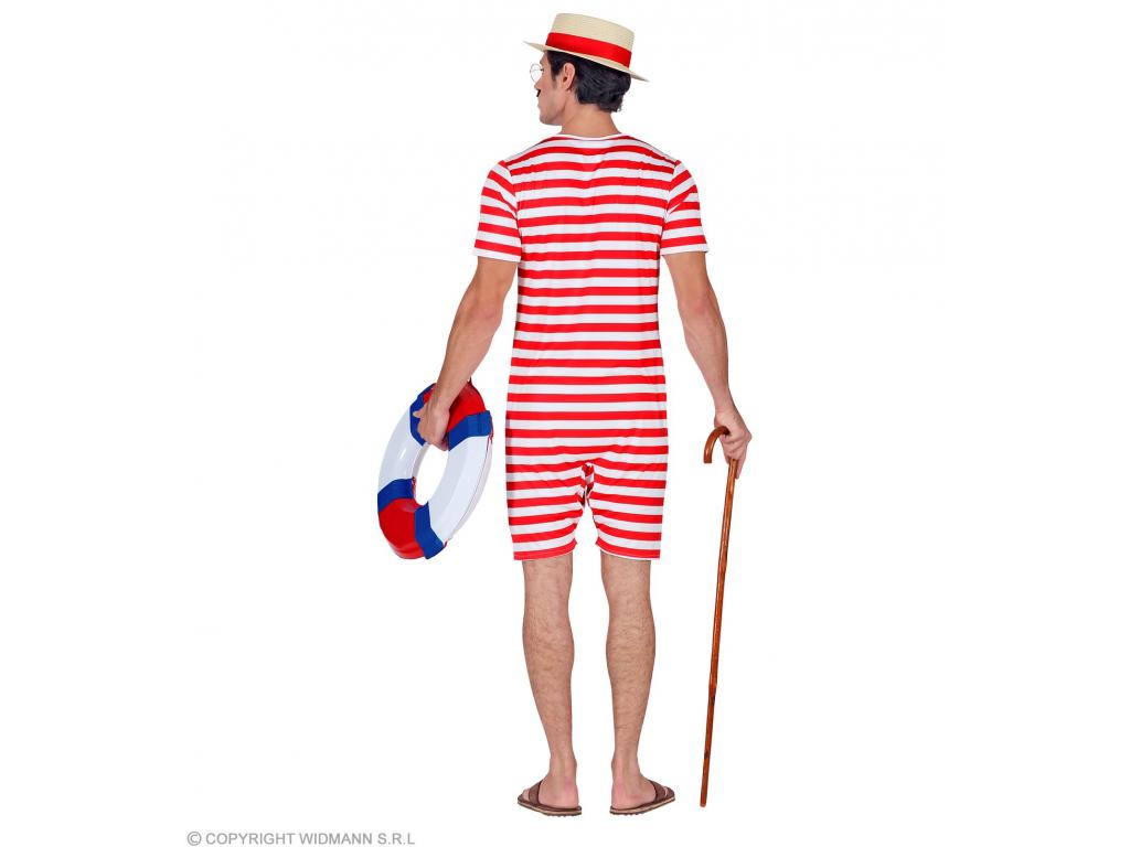 A Retro fürdőruha piros fehér csíkos férfi jelmez leírása: