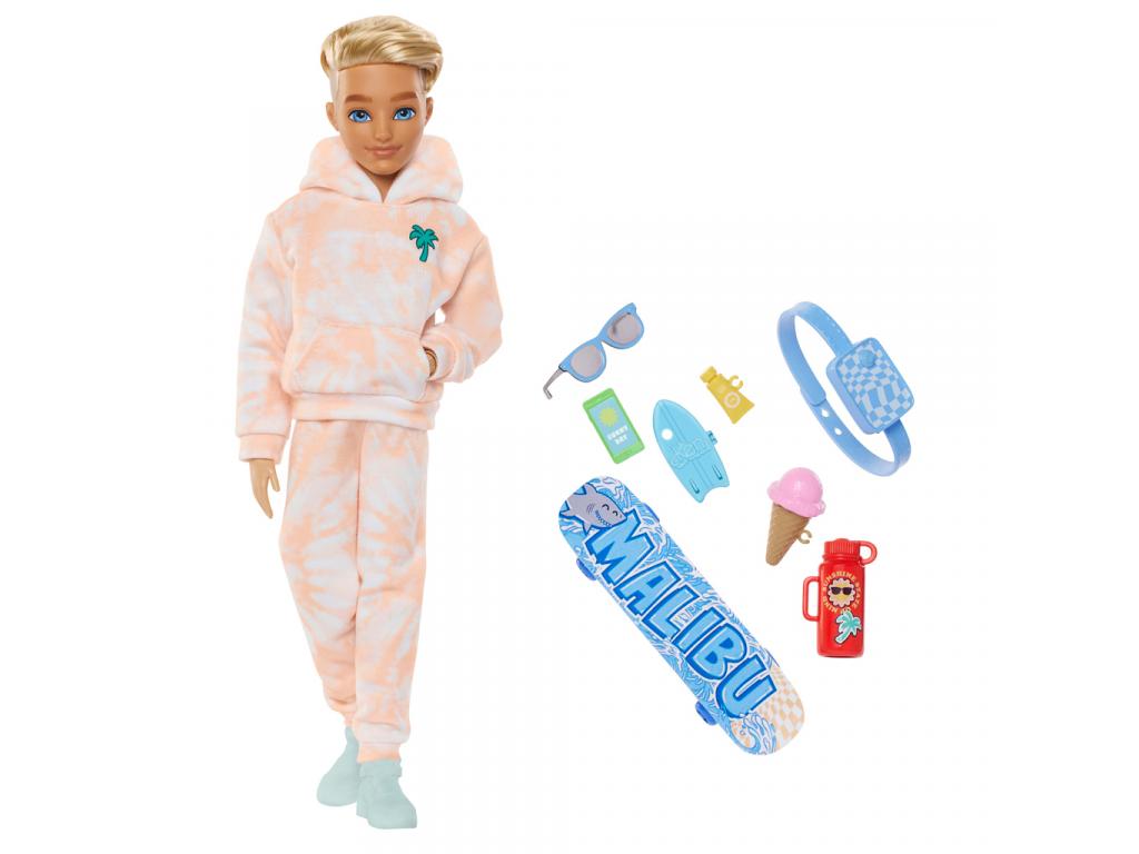 Ken babát egy narancs-fehér batikolt melegítő szettben találod, amely tökéletesen illik a szabadidős, kaliforniai életstílusához. A pálmafa motívum a pulóverén a nyári hangulatot idézi, míg a kényelmes cipők ideálisak a sportos vagy hétköznapi tevékenységekhez. A baba kiegészítői között megtalálható egy szörfdeszka, amely a tengerparti kalandokhoz passzol, egy "Malibu" feliratú gördeszka, amellyel izgalmas városi történeteket lehet kitalálni, valamint egy napszemüveg, ami stílust és védelmet nyújt a napsütésben.