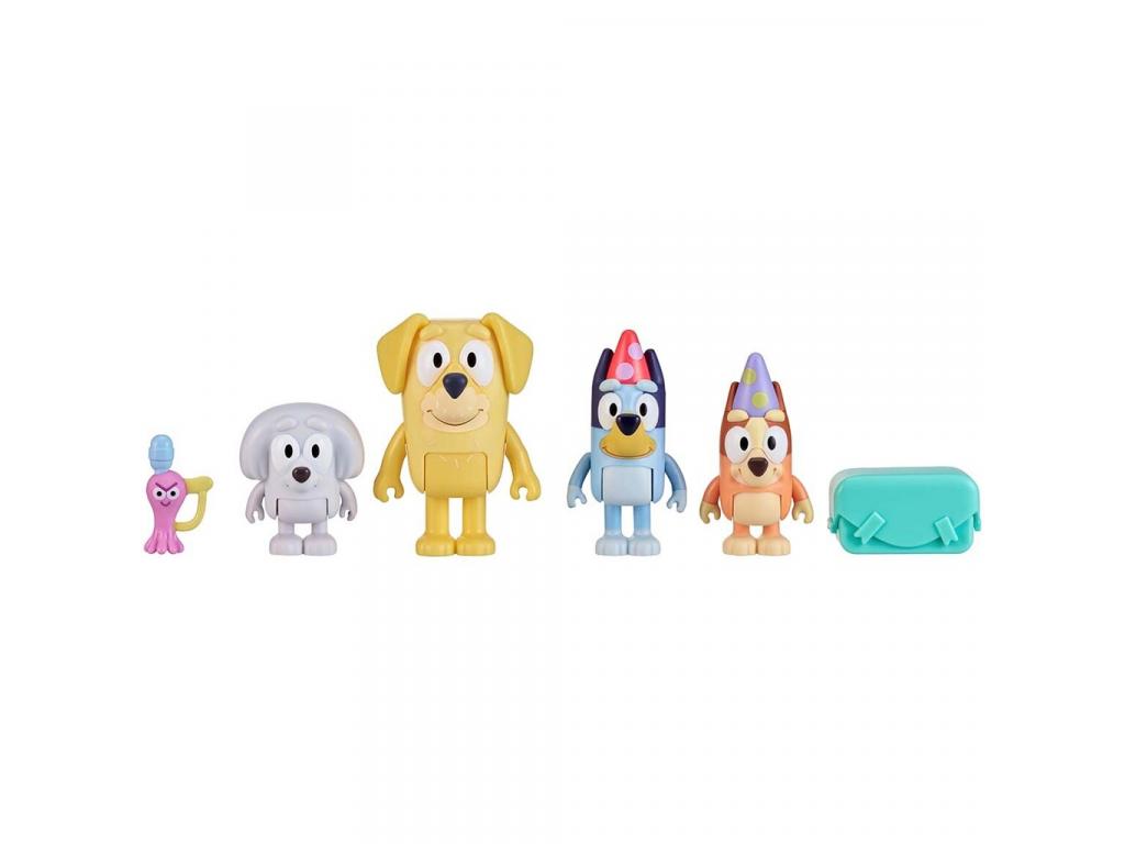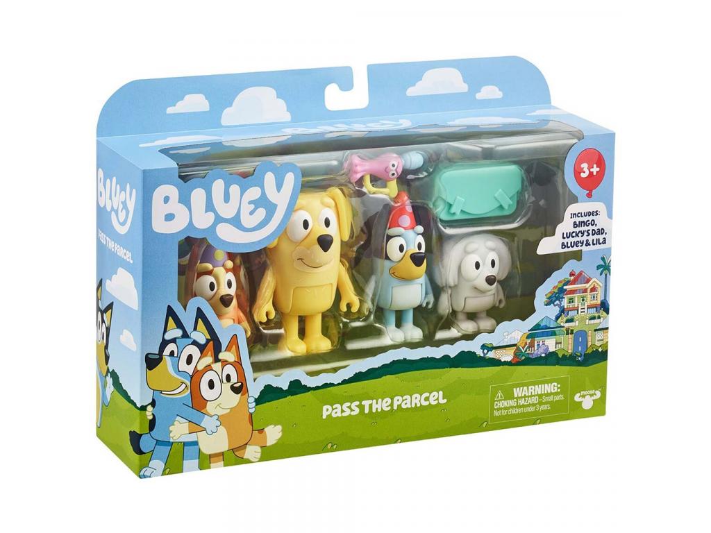 - Négy darab Bluey figura: Bluey, Bingo, Lucky apukája és Lila