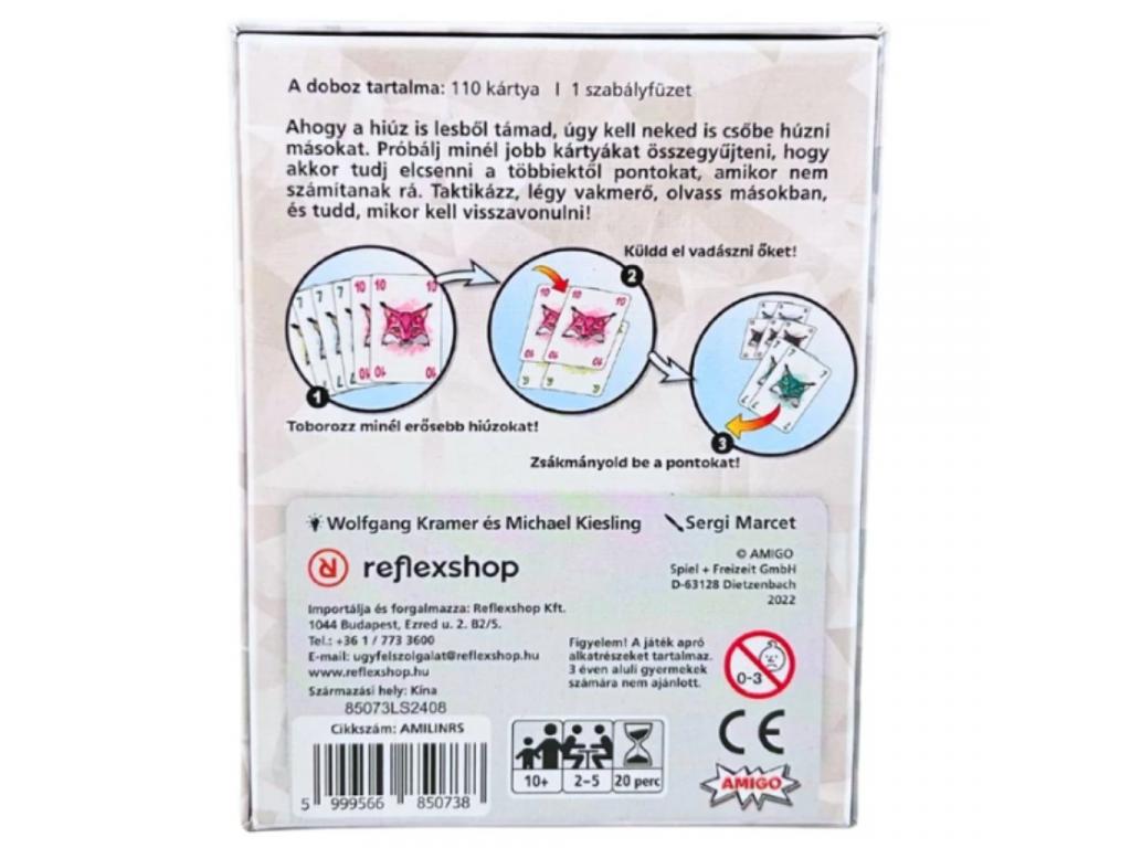A Hiúzz egyet! egy szórakoztató, fordulatos kártyajáték, amelyben a stratégia és a lopás kerül a középpontba! A cél, hogy minél több kártyát gyűjts össze magad elé, mert ezek hozzák a pontokat. Azonban légy résen, mert a többiek bármikor elcsenhetik tőled ezeket a kártyákat, és akár a pontjaidat is! A játék egyszerű szabályai miatt könnyen tanulható, de a folyamatos rivalizálás miatt mindig izgalmas marad. Játszd ki a kezed okosan, lopj ügyesen, és szerezz annyi pontot, hogy te legyél a győztes. Tökéletes választás családi délutánokra és baráti összejövetelekre!