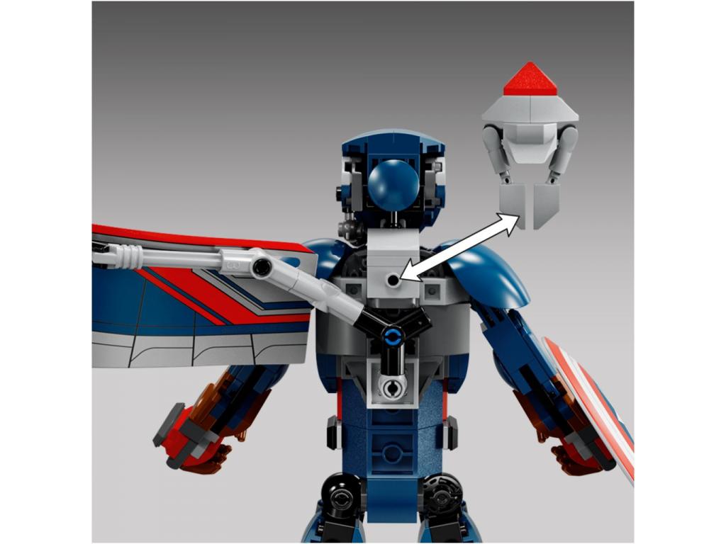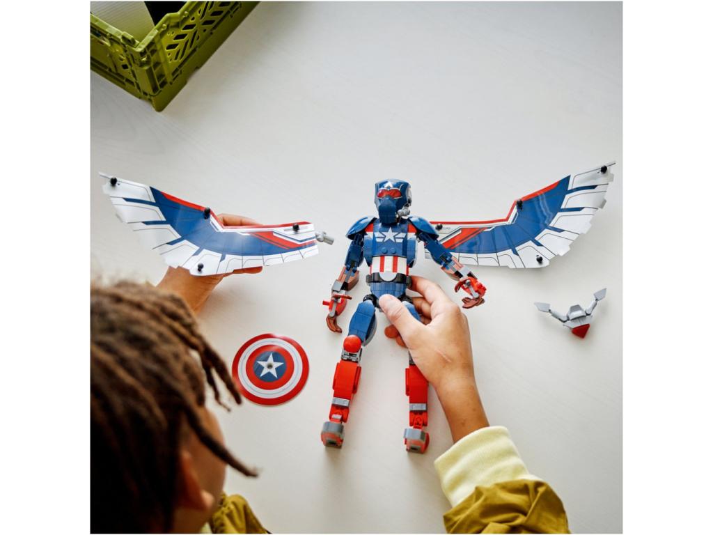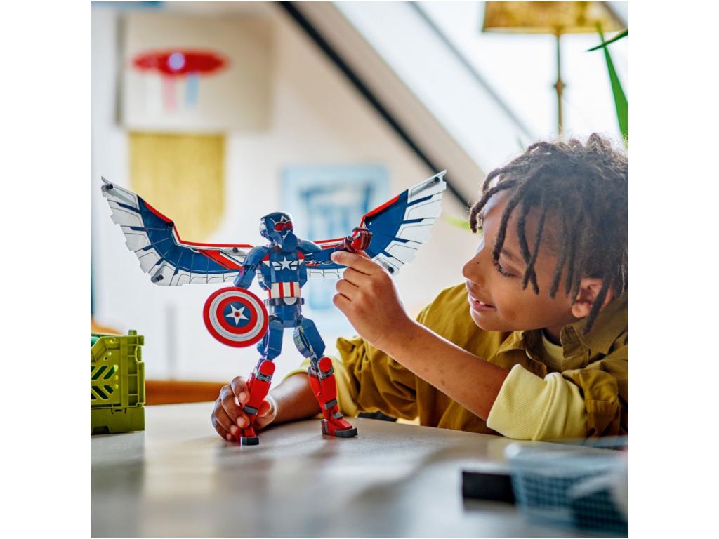 A megépíthető szuperhősjáték 28 cm magas, váll-, kar-, csípő- és lábillesztései mozgathatók, így a gyerekek valósághű akciópózokba állíthatják a modellt, miközben elmerülnek a fantáziadús játékban. A hatalmas fóliaszárnyak a figura hátára vannak rögzítve. A szárnyak hajlíthatók, hogy imitálni lehessen a szárnycsapásokat, de könnyedén le is lehet venni őket, ha az akciók ismét a földön zajlanak. Amerika Kapitány figura az ikonikus pajzsát tartja, és tartozik hozzá egy megépíthető, Vörös Szárny nevű játék drón is, amely a hátára van rögzítve, de a gyerekek könnyedén levehetik, hogy szabadon játszhassanak. A plusz digitális élmény érdekében az építők felnagyíthatják, elforgathatják a szettek 3D-s változatát, és követhetik a haladásukat az intuitív LEGO Builder appal.