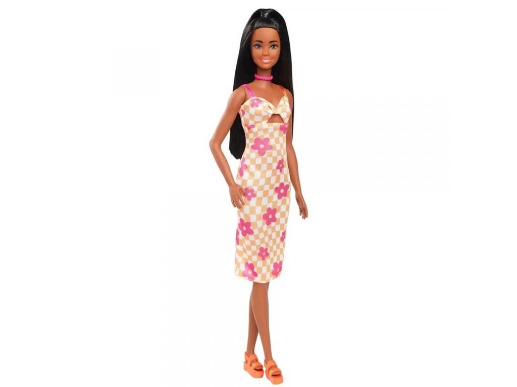 A Barbie: Fashionista stílusos baba kockás, virágos mintás ruhácskában - Mattel leírása: