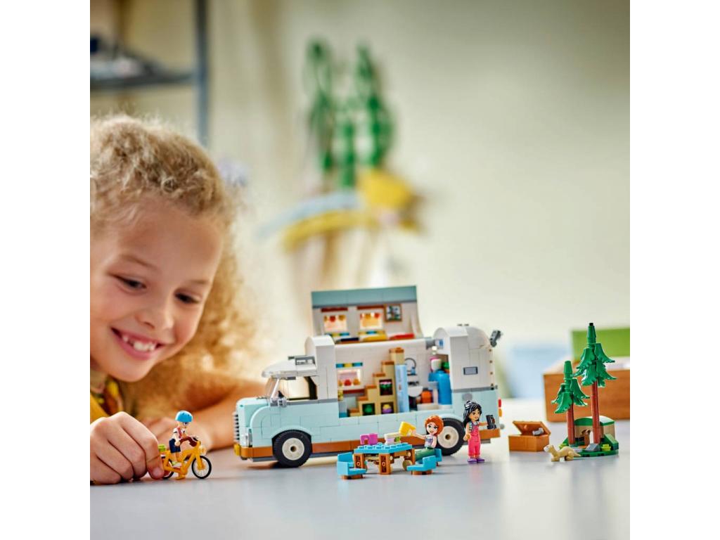 Ebben a gyermekeknek készült, lakóautót tartalmazó játékkészletben mindent megtalálsz, amire az ifjú felfedezőknek szükségük lehet, hogy elmeséljék saját, kempingezős történeteiket. A barátok a lakóautó vezetőfülkéjében ülnek, amikor megtalálják a tökéletes helyet az erdőben. Az autó kinyílik, hogy felfedezd a konyhát, a főzéshez szükséges eszközöket és a mosdót. Biztos kuncognak majd a gyerekek, ha megnézik, hogyan lehet lehúzni a vécét! Lépcső vezet az alvóhelyre, ahol 3 ágy van a figurák számára. A készlet olyan további részleteket is tartalmaz, mint a kerékpár, amelyet használhatnak a figurák, a kempingasztal és a székek, a kinti zuhanyzó és a kempingkiegészítők, például az iránytű, a villáskulcs és a távcső.