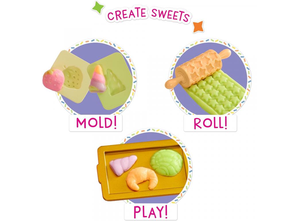 A csomag tartalmaz fagylaltkészítő formát, sütiformákat, nyújtófát mintás hengerekkel és különböző kiegészítőket, például poharakat, kanalat és cukrászati díszítő elemeket. A kis pékek különféle sütiket, fagyikat és desszerteket formázhatnak, majd saját ízlésük szerint díszíthetik őket. A szerepjáték során a gyerekek eljátszhatják, hogy egy igazi cukrászdát vezetnek, ahol vendégeiket finomabbnál finomabb édességekkel kényeztetik.