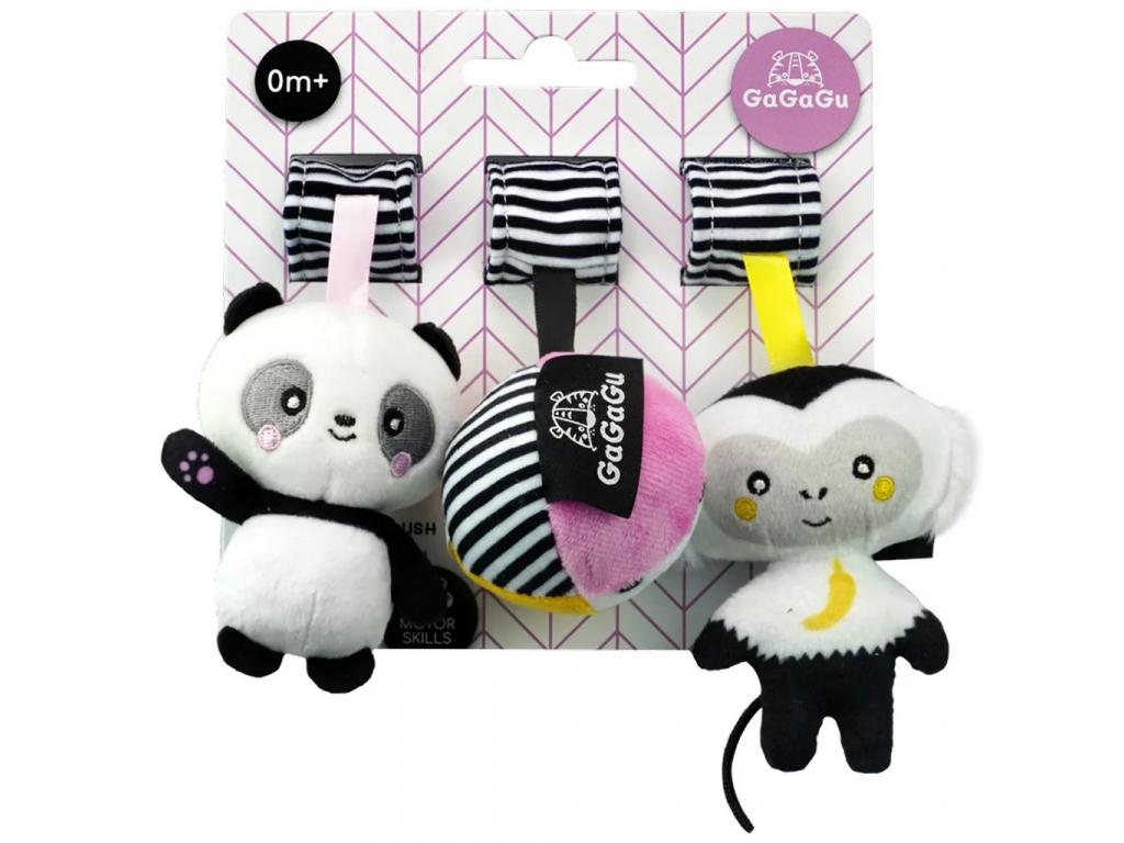 A GaGaGu logó plüssök panda, labda és majom egy imádnivaló és fejlesztő babajáték szett, amely tökéletes első játéktárgy a legkisebbek számára. Ezek a puha, aranyos figurák nemcsak ölelgetésre és babusgatásra alkalmasak, hanem segítik a csecsemők érzékszervi fejlődését is, támogatva a látás, tapintás és finommotoros készségek fejlődését.
