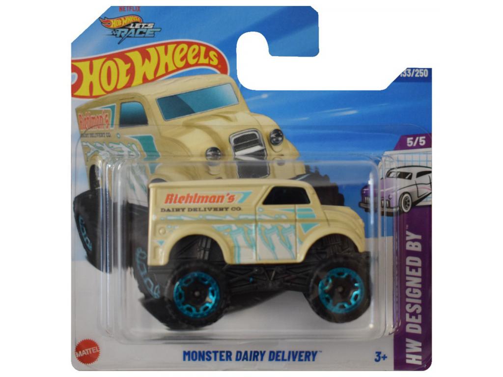 A Monster Dairy Delivery kisautó egy igazán különleges és mókás darab a Hot Wheels kínálatából, amely ötvözi a retro tejfutár autók hangulatát a hatalmas monster truck stílussal. Ez a tejszállító nem a békés reggeli kiszállításról szól ez egy igazi szörnyeteg a pályán! A világos sárga karosszéria, kék mintázatok és a hatalmas, világító kék felnikkel szerelt kerekek igazán figyelemfelkeltővé teszik. A HW Designed By sorozat tagjaként a Hot Wheels saját tervezőinek kreativitását dicséri. Tökéletes választás olyan gyerekek számára, akik szeretnek nevetni, meglepődni és vagány járművekkel játszani garantáltan nem hétköznapi élményt nyújt. A nagy kerekeknek köszönhetően bármilyen terepen megállja a helyét: szőnyegen, homokozóban, sőt még Hot Wheels pályán is.