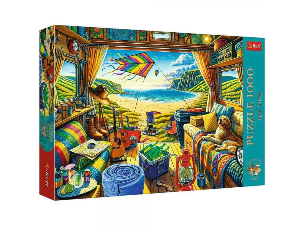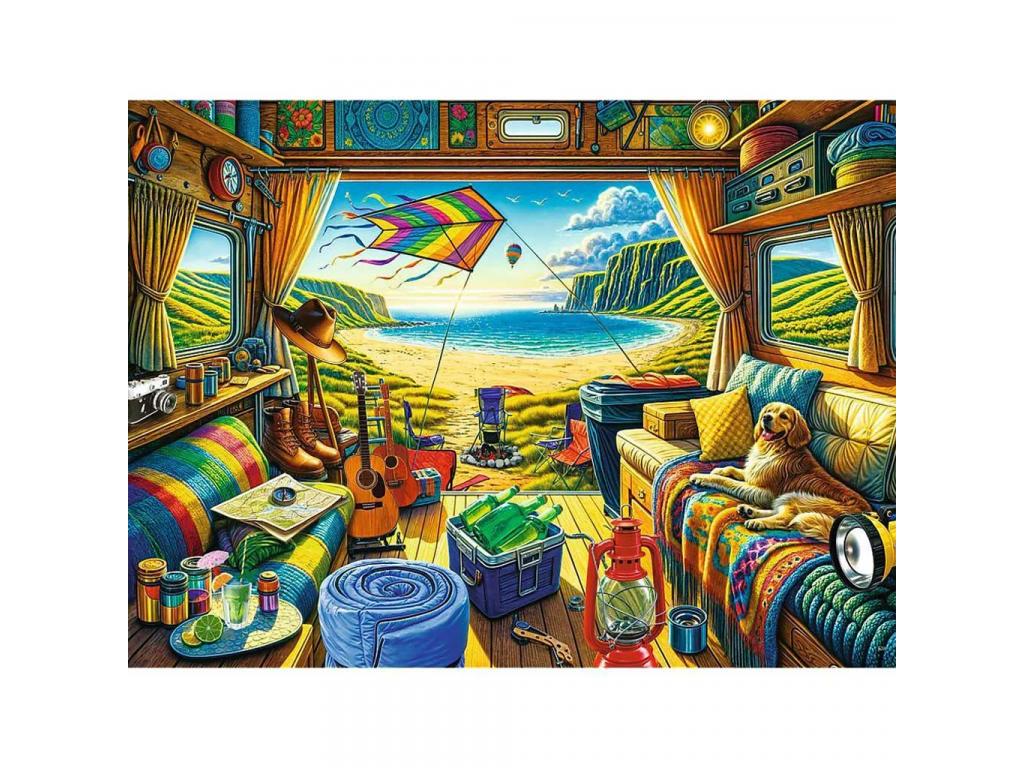 Ez az 1000 darabos Trefl prémium plusz puzzle egy igazán különleges hangulatú képet tár eléd, amely a szabadság és a természet szerelmeseinek szól. A lakóautó belsejéből nyíló festői kilátás egy gyönyörű, tengerparti tájat ábrázol, ahol a kék ég, a zöldellő sziklák és az aranyló homok egy mesebeli nyári kalandot idéz. A kép tele van élettel és apró részletekkel: egy aranyos kutya pihen a kanapén, a szélben színes sárkány lebeg, a kempingfelszerelések pedig a gondtalan utazás hangulatát keltik.