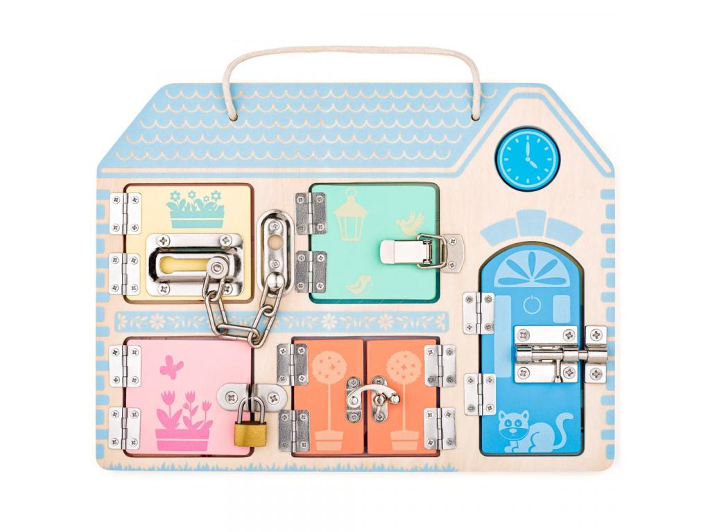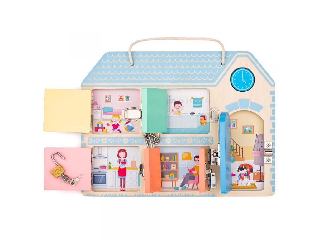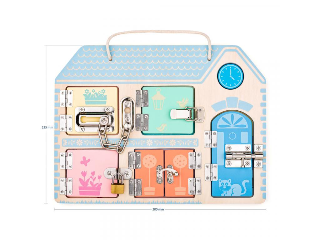A házikó formájú tábla különböző méretű és színű ajtókat tartalmaz, mindegyik más-más típusú zárral vagy reteszelési mechanizmussal. A kicsik kipróbálhatják a lakatot kulccsal, a láncos reteszt, a tolózárat és más zárszerkezeteket, miközben játékosan fejlesztik kézügyességüket és logikai gondolkodásukat. Minden ajtó mögött egy kedves, otthoni életképet ábrázoló illusztráció bújik meg, ami még izgalmasabbá teszi a felfedezést.