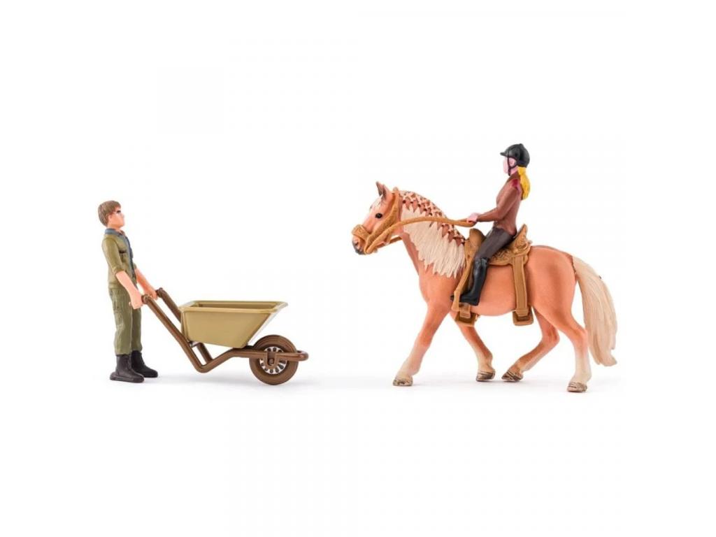 A készlet két figurát is tartalmaz: egy lovast és egy gondozót. A lovas egy barna ruhás figura, aki fekete lovaglósisakot visel, és természetesen lovagolni is tud a mellékelt lón. A gondozó egy farmer ruházatú alak, aki a farmi munkálatokat végzi, például eteti a lovat vagy takarítja az istállót.
