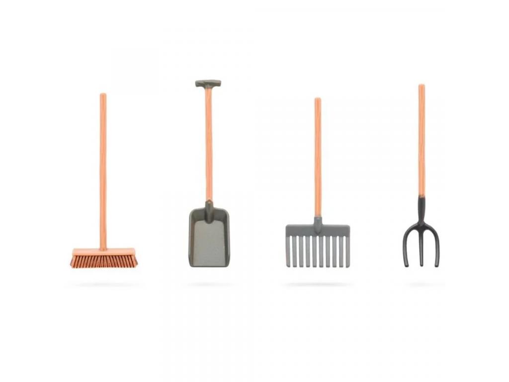 Számos kiegészítő, például talicska, gereblye, vödrök és szénabála