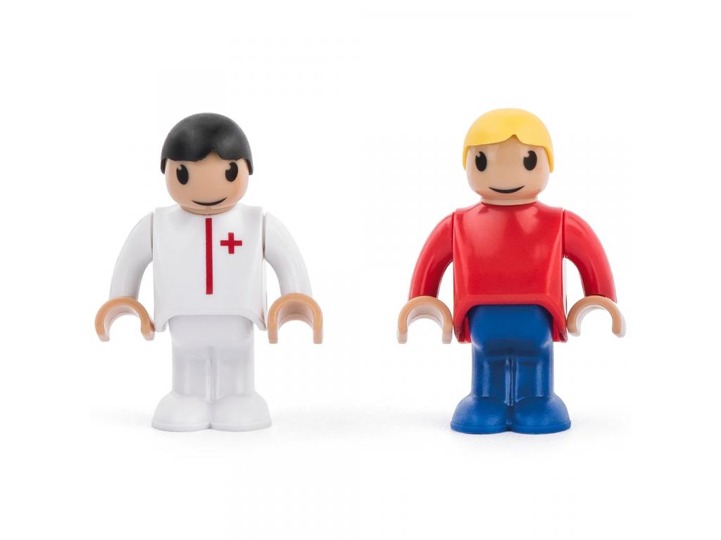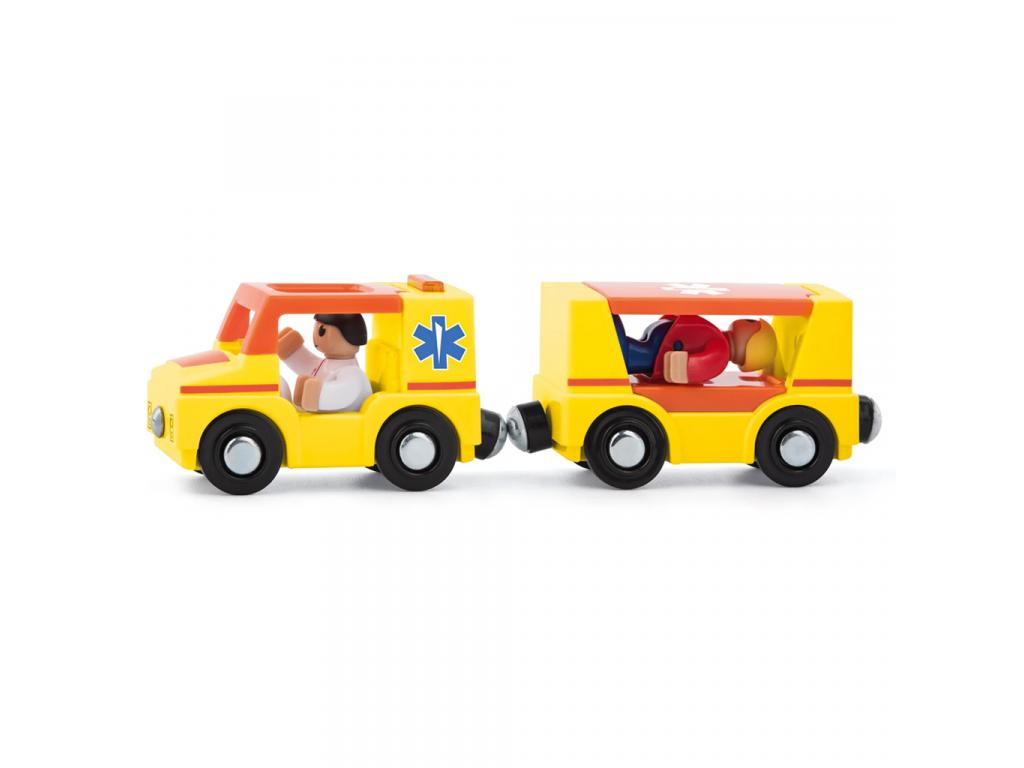 A járművek élénk sárga színe és mentős szimbólumai még valósághűbbé teszik a játékot. A vezetőfülkében egy mentős figura ül, aki irányítja az autót, míg a pótkocsiban egy sérült beteg fekszik, akit a gyerekek kórházba szállíthatnak. A figurák kivehetők, így a gyerekek aktívan bevonhatják őket a játékba, és különböző mentési jeleneteket játszhatnak el.