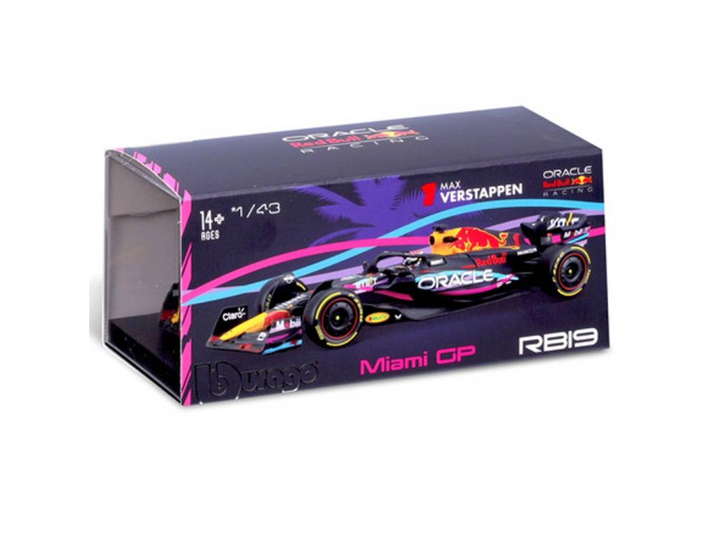 Bburago: Red Bull RB19 F1 versenyautó fém autómodell 1/43 (Max Verstappen #1, Miami GP különkiadás, sisakos)