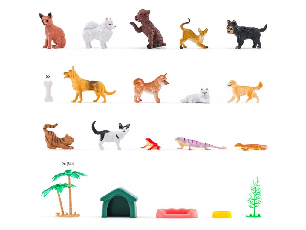 A készletben megtalálhatók a legnépszerűbb házi kedvencek, például kutyák, macskák, nyulak és madarak, de még egy akváriumi hal vagy egy teknős is helyet kapott benne. A részletesen kidolgozott figurák élethűek és színesek, így a kicsik könnyedén megismerhetik és megtanulhatják az állatok nevét és tulajdonságait. A játékélményt különféle kiegészítők teszik még izgalmasabbá, mint a kutyaház, a csont, az etetőtál és a növények, amelyek segítségével a gyerekek kialakíthatják saját kis állatbarát környezetüket.