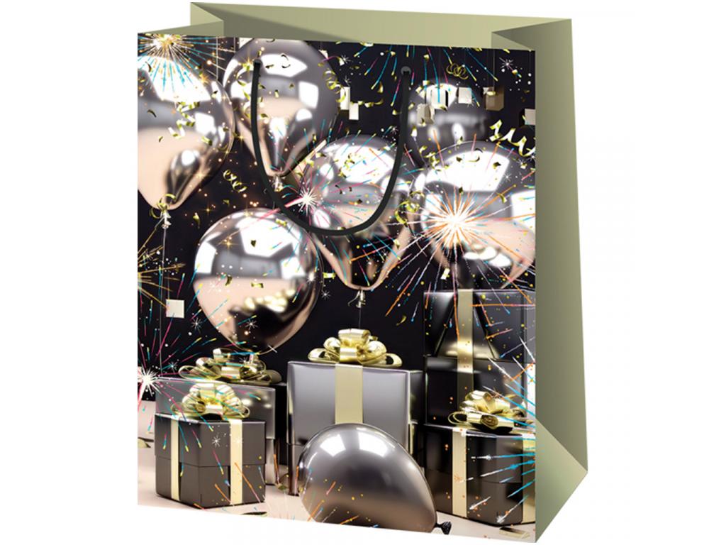 A táska dizájnja a luxus érzetét kelti: a tükröződő arany és ezüst lufik, a konfettik és a tűzijáték-effektus még ünnepibbé teszik az összképet. Az oldalak elegáns arany árnyalatot kaptak, amely tökéletesen kiegészíti az előlap ragyogását. Az erős papíranyag biztosítja, hogy a táska strapabíró és tartós legyen, a fekete zsinórfülek pedig kényelmes fogást nyújtanak.