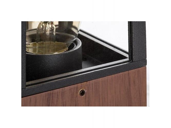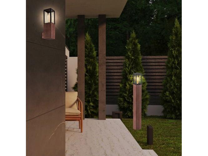 A modern stílusú Wales kültéri fali lámpa különösen jól mutat a teraszon fából készült kiegészítők társaságában. A Wales fa mintázatú alsó részéhez matt fekete kerettel ellátott átlátszó üvegbúra kapcsolódik, a lámpa az alsó részből kinyúló fa mintázatú elem segítségével rögzíthető a falra. Természetesen nemcsak a teraszon, hanem a ház külső falán másutt is felszerelhetjük ezt a modellt: megvilágíthatjuk vele a bejárathoz vezető gyalogutat vagy a kapu környékét. A Wales egy darab legfeljebb 60 W teljesítményű fényforrással használható, a foglalat típusa E27. A kültéri lámpa méretei a következők: magassága 310 mm, faltól mért távolsága 125 mm, beépítési átmérője 65 mm. A lámpa IP44-es védettsége garantálja, hogy legfeljebb 1 mm átmérőjű tárgyak behatolása ellen, valamint bármilyen irányból fröccsenő víz ellen védett. A Wales kültéri fali lámpát fényforrás nélkül szállítjuk.