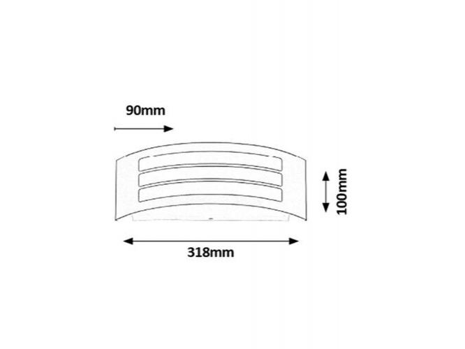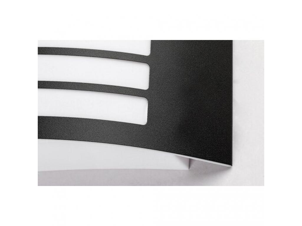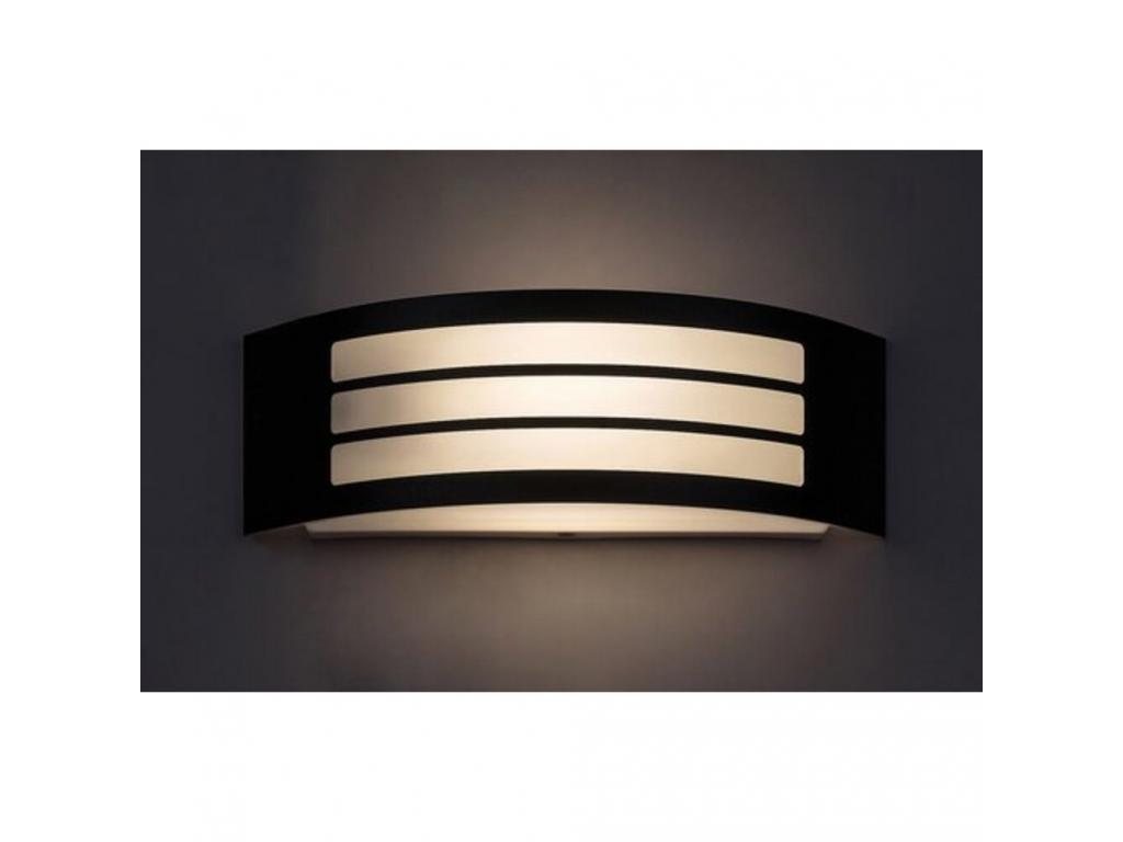 Modern megjelenésű kültéri fali lámpa, UV sugárzásnak ellenálló kivitelben, IP44-es, azaz fröccsenő víz elleni védelemmel. A 10 cm magas, 31,8 cm széles, íves formájú, antracit szürke színű fém házból és műanyag lámpabúrából összeállított lámpatest E27-es foglalatú, max. 14W teljesítményű, energiatakarékos fényforrással használható. A modell hagyományos fényforrással nem üzemeltethető!
