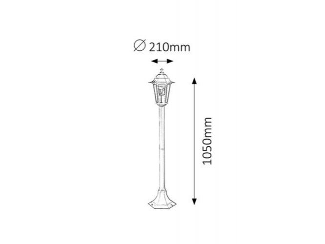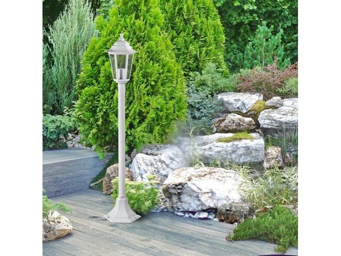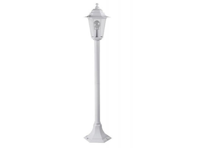 Klasszikus megjelenésű kültéri állólámpa 1 db foglalattal. 105 cm magas, 21 cm átmérőjű, fehér színű fém lámpatest és víztiszta üvegbetétes lámpabúra, IP43-as védettséggel. A lámpatest E-27-es foglalatú, max. 60W teljesítményű energiatakarékos fényforrással is használható.