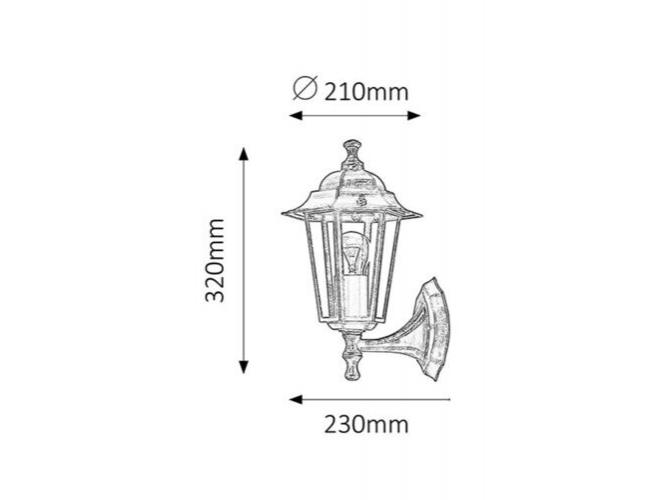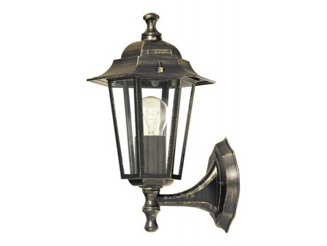 Klasszikus megjelenésű kültéri falikar 1 db foglalattal, felső állású kivitelben. 32 cm magas, 23 cm kinyúlású, antik arany színű fém lámpatest és víztiszta üvegbetétes lámpabúra, IP43-as védettséggel. A lámpatest E-27-es foglalatú, max. 60W teljesítményű energiatakarékos fényforrással is használható.