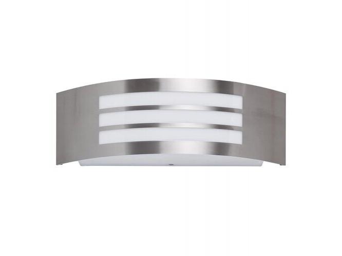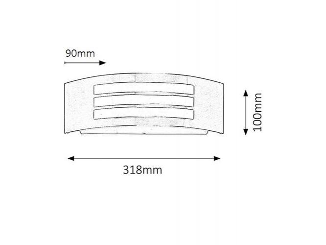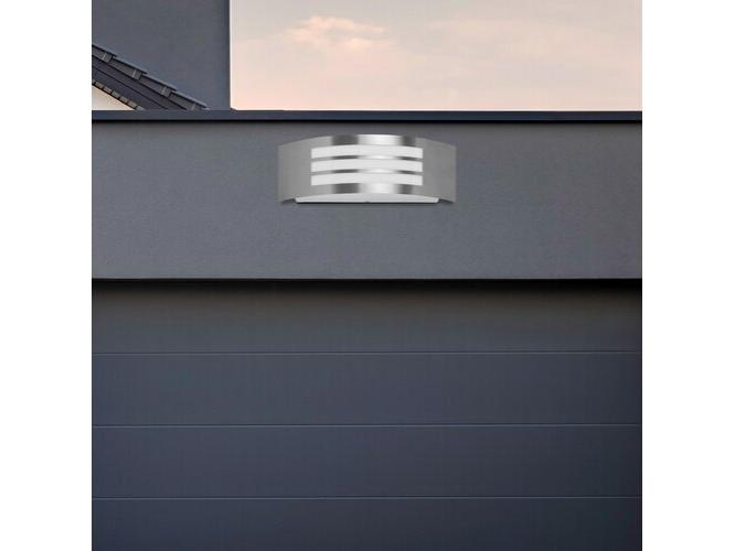 Modern megjelenésű kültéri fali lámpa, UV sugárzásnak ellenálló kivitelben, IP44-es, azaz fröccsenő víz elleni védelemmel. A 10 cm magas, 31,8 cm széles, íves formájú, rozsdamentes acél színű fém házból és műanyag lámpabúrából összeállított lámpatest E27-es foglalatú, max. 14W teljesítményű, energiatakarékos fényforrással használható. A modell hagyományos fényforrással nem üzemeltethető!