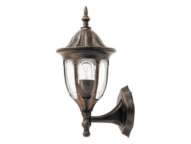 Klasszikus megjelenésű kültéri falikar 1 db foglalattal. 22 cm kinyúlású, 37 cm magas, antik arany színű, fémből készített lámpatest és üvegbúra, IP43-as védettséggel. A lámpatest E27-es foglalatú, max. 60W teljesítményű fényforrással használható.