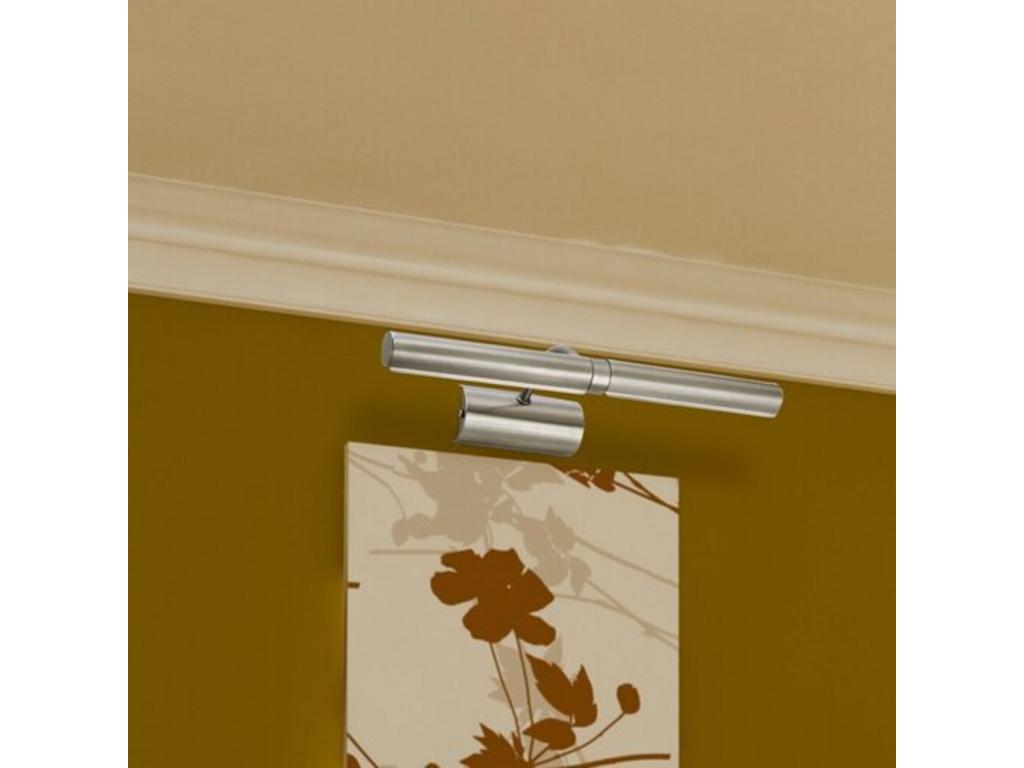 Konvencionális megjelenésű képmegvilágító fali lámpa 36.4 cm-es széles kivitelben. Szatin króm színű fém váz, 2 darab E14-es foglalattal. A lámpatest T25-ös típusú, maximum 2x 40W teljesítményű, energiatakarékos fényforrásokkal is üzemeltethető.